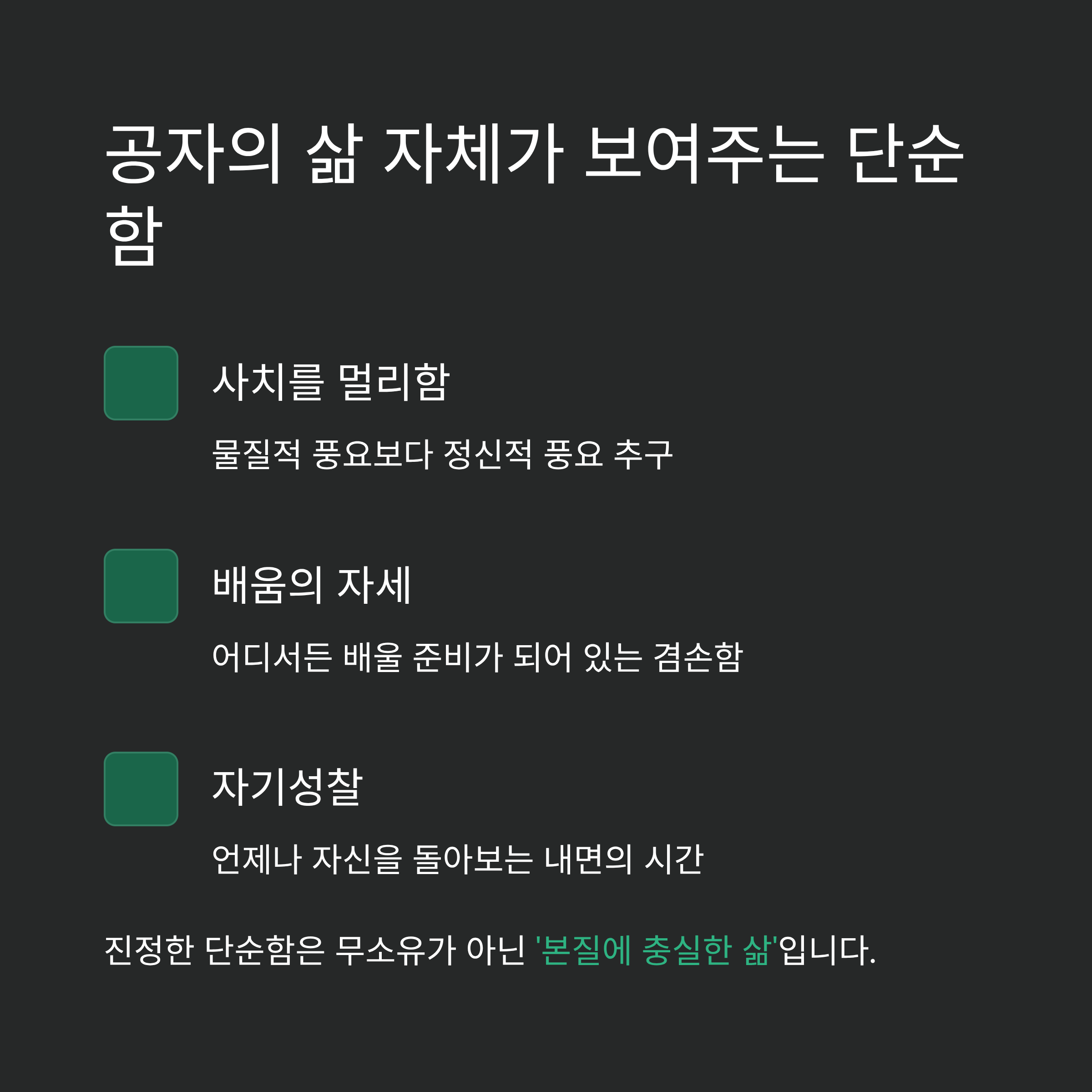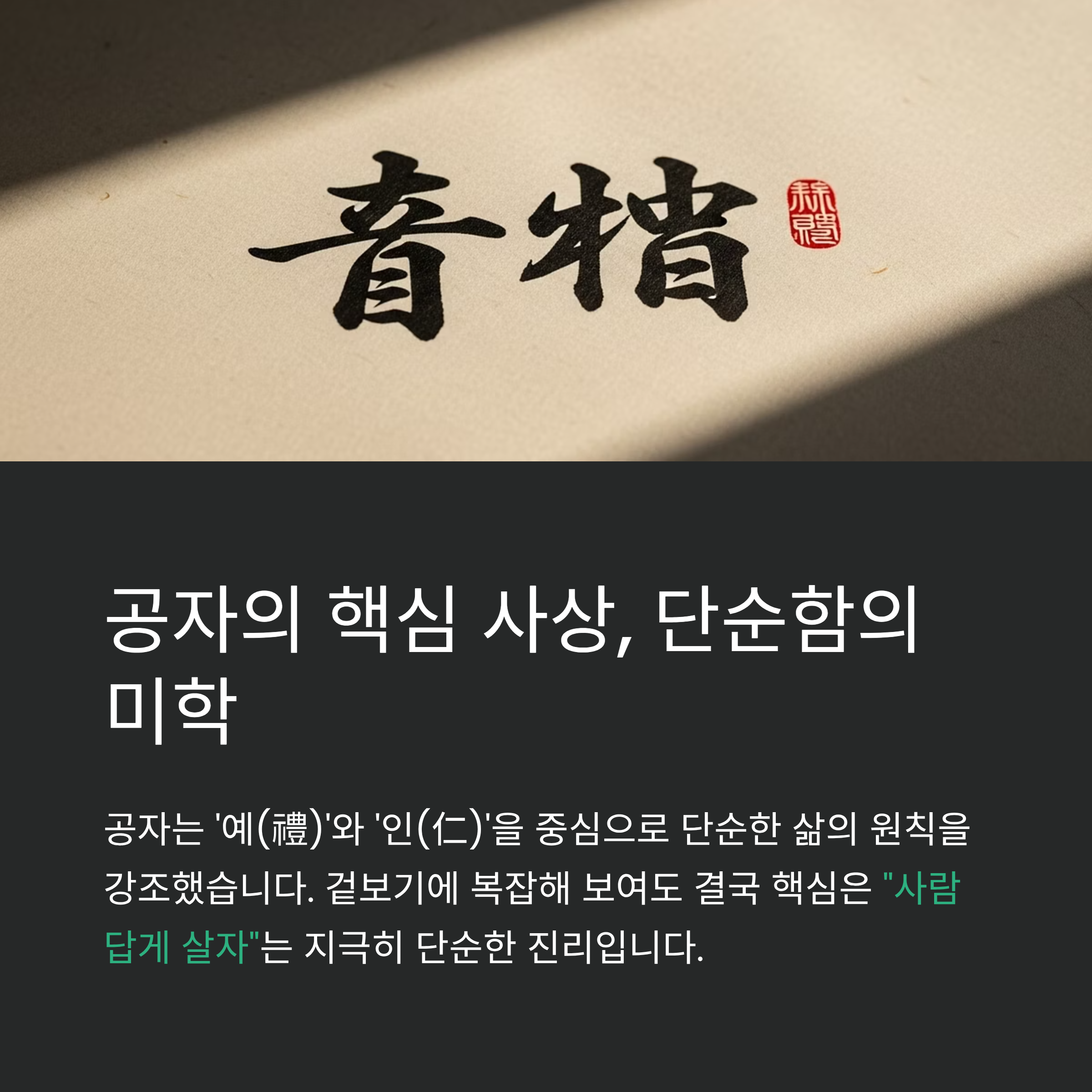공자는 '예(禮)'와 '인(仁)'을 중심으로 한 단순한 삶의 원칙을 강조했습니다.