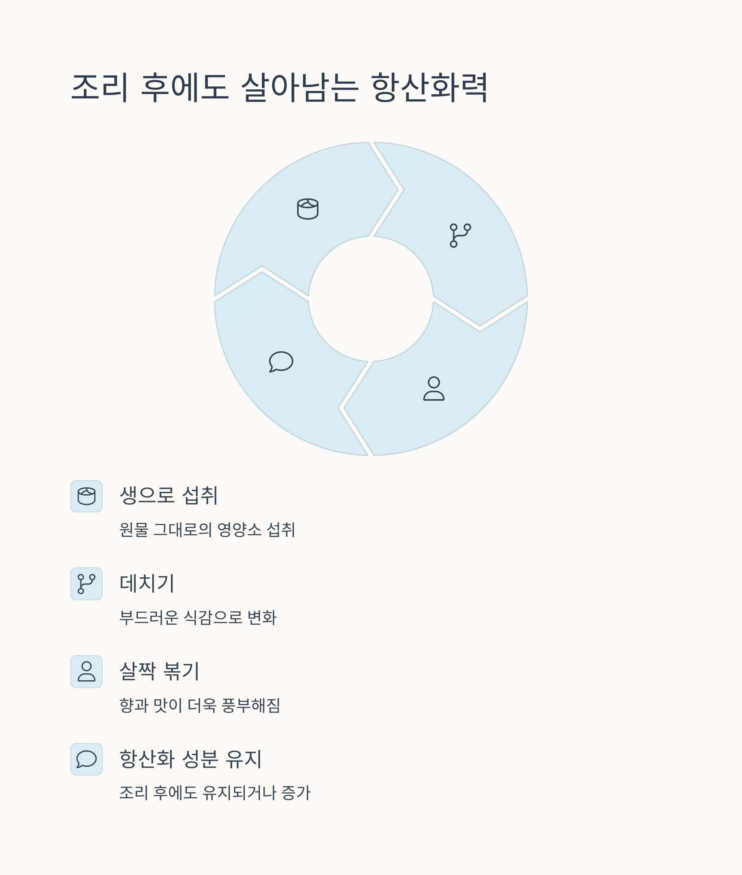놀랍게도 곰취에 들어 있는 항산화 물질은 조리 후에도 유지되거나 오히려 증가하는 성질을 지닙니다.