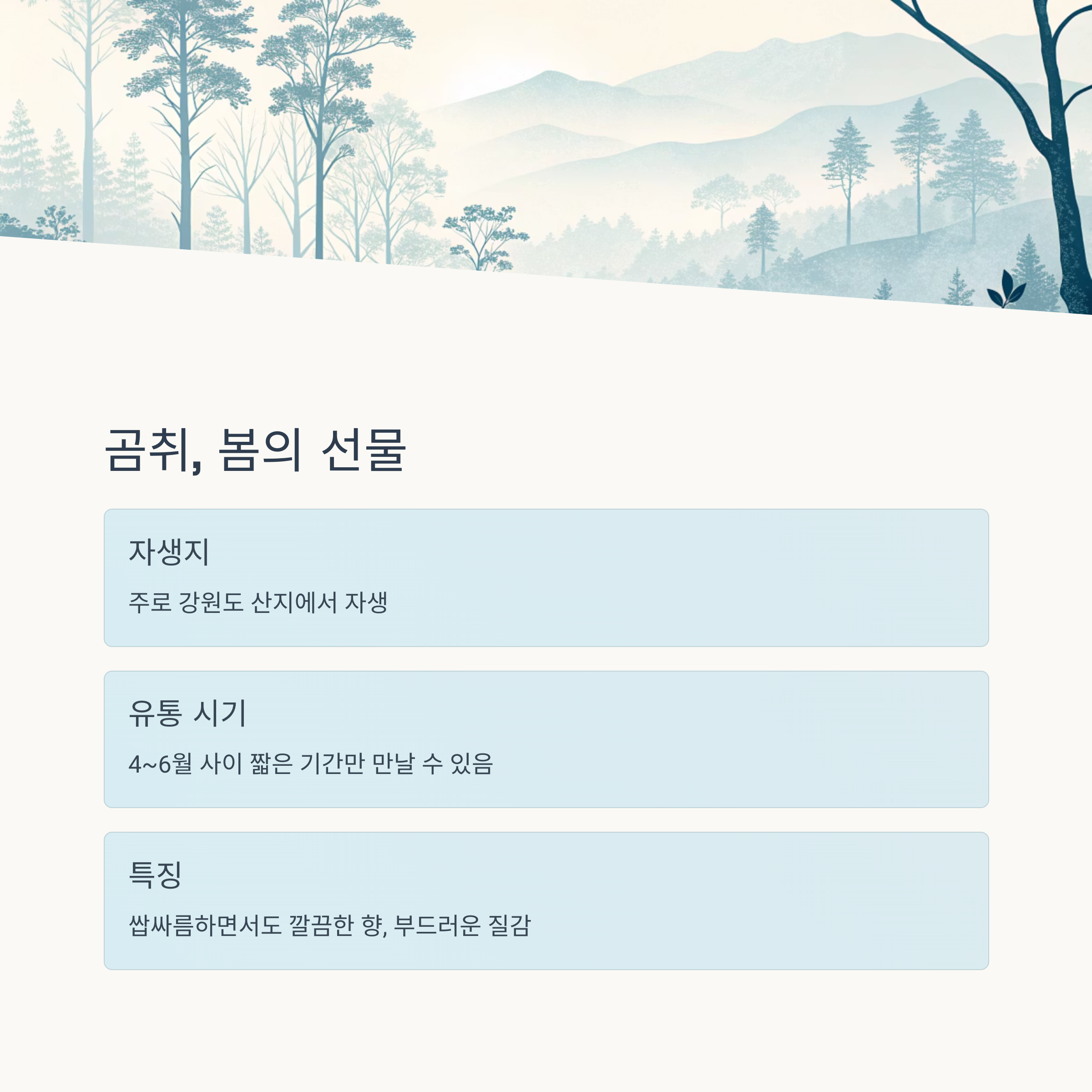 곰취는 주로 강원도 산지에서 자생하는 봄철 산나물로, 4~6월 사이 짧게 유통됩니다.
