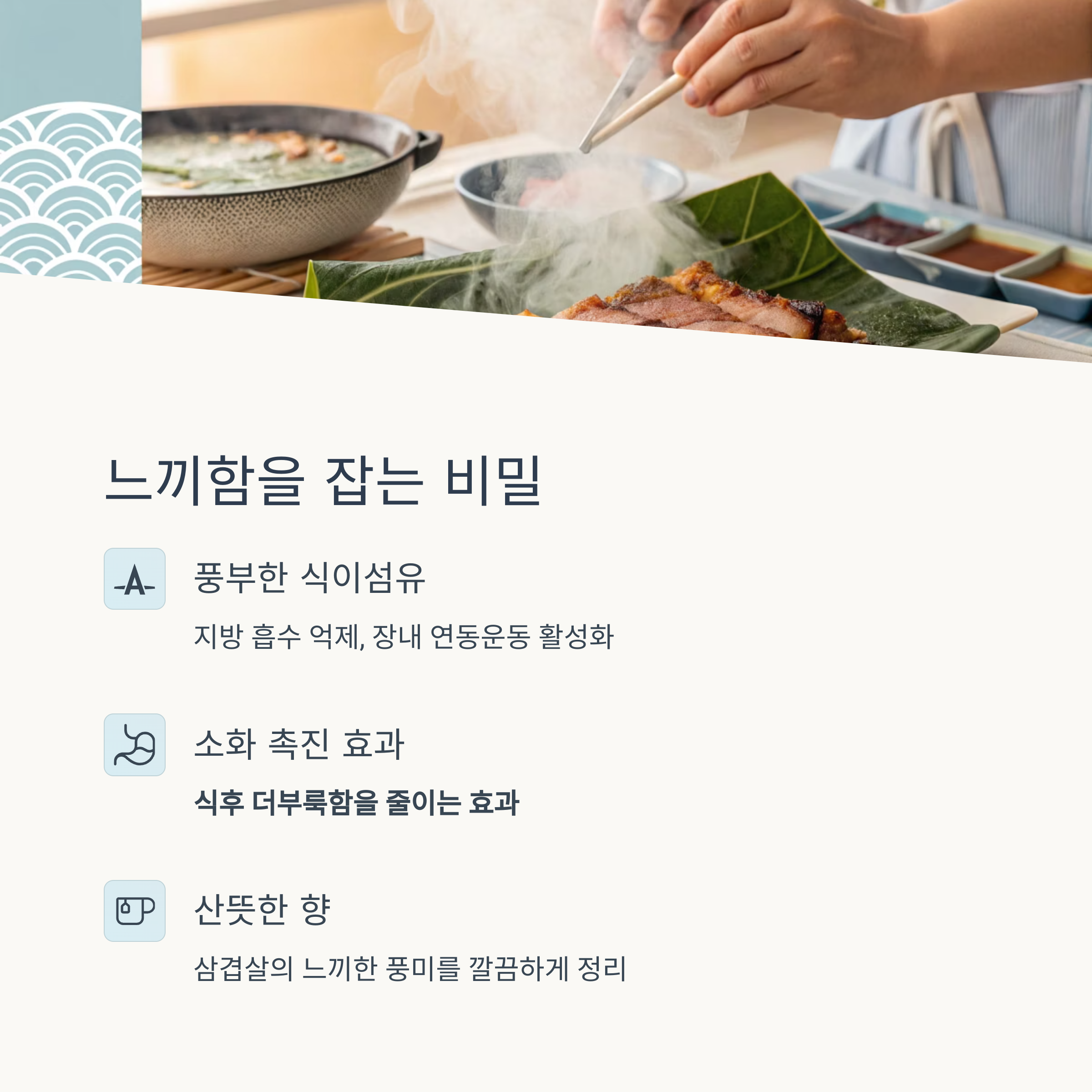 쌉싸름하면서도 깔끔한 향이 특징이며, 잎과 줄기가 부드러워 삼겹살과 함께 먹기에 이상적인 질감을 제공합니다.