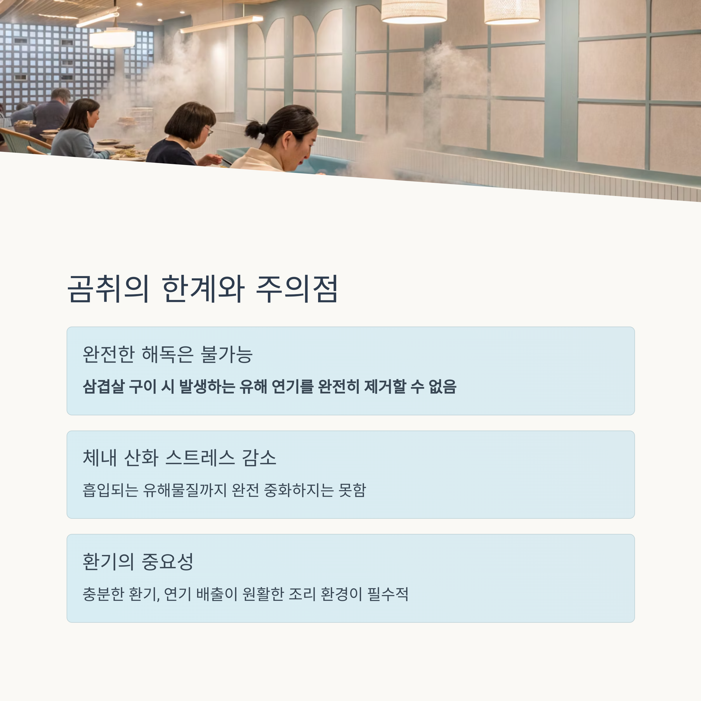 곰취는 건강에 이로운 식재료지만, 삼겹살 구이 시 발생하는 유해 연기를 완전히 제거할 수는 없습니다.