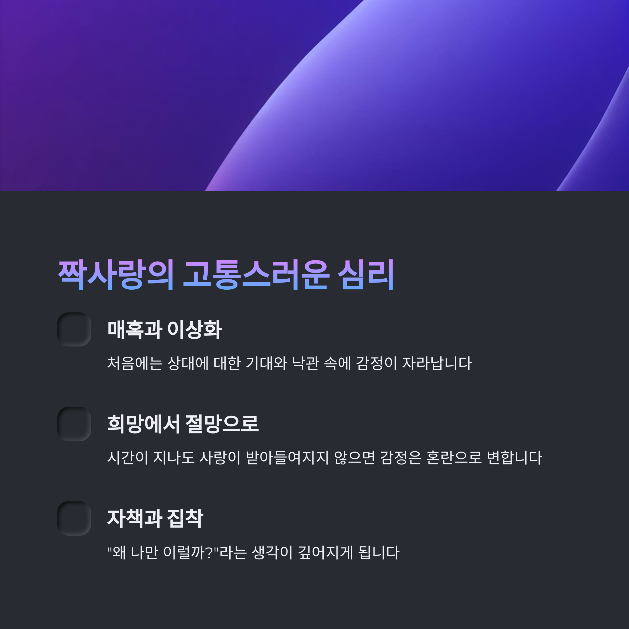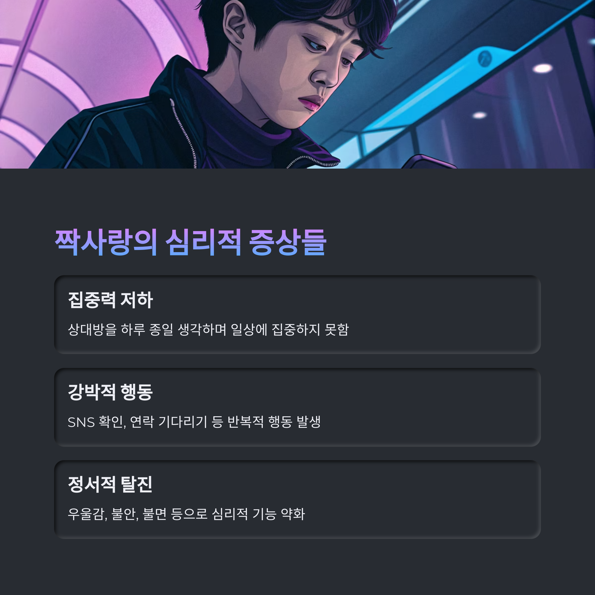 짝사랑이 지속되면 감정은 현실과 충돌하고, 이로 인해 우울, 불안, 집중력 저하, 심지어 신체 증상까지 초래합니다