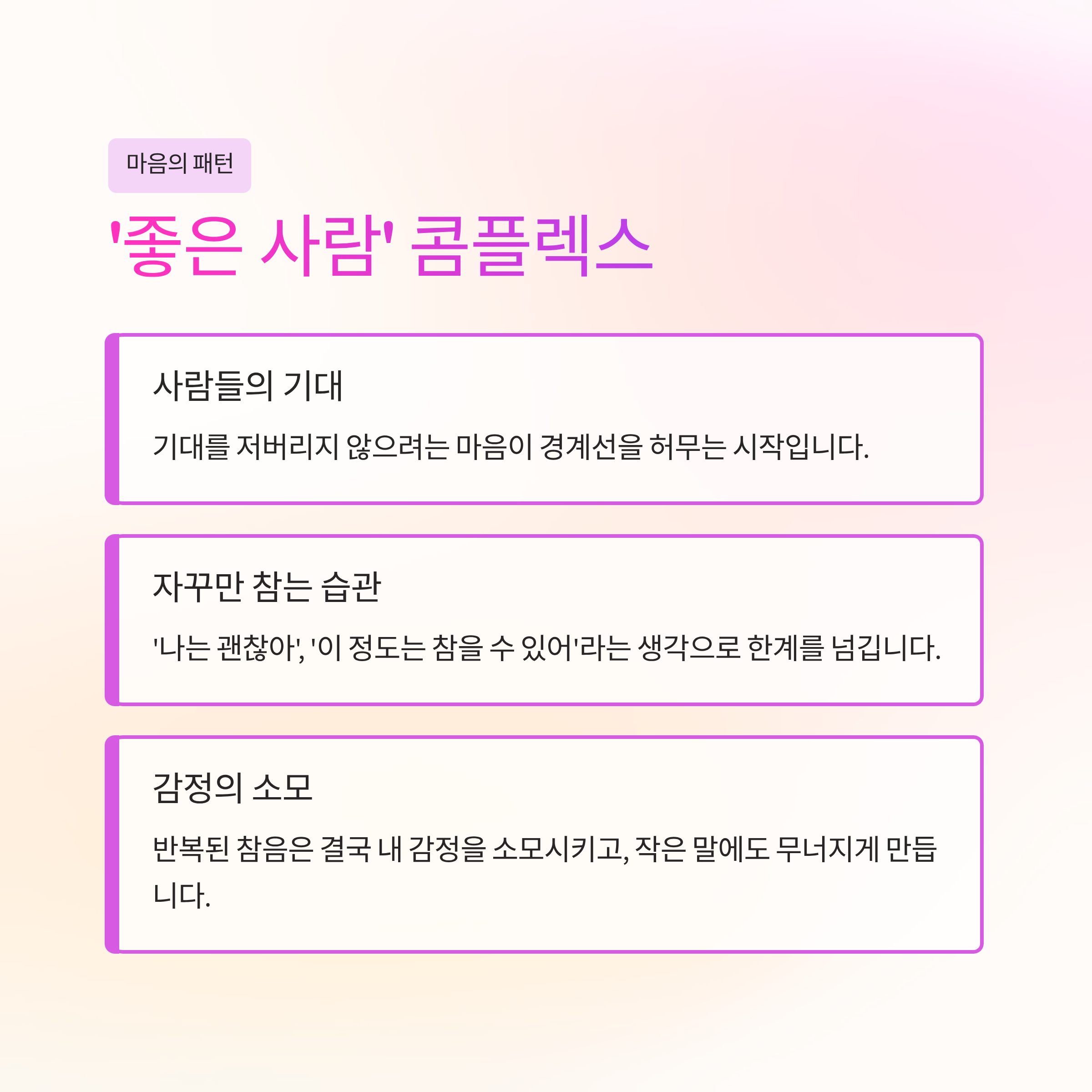 '나는 괜찮아', '이 정도는 참을 수 있어'라는 생각으로 자신의 한계를 넘기곤 하지요. 하지만 이 반복은 결국 내 감정을 소모시키고, 어느 순간 작은 말에도 무너지는 내가 됩니다.