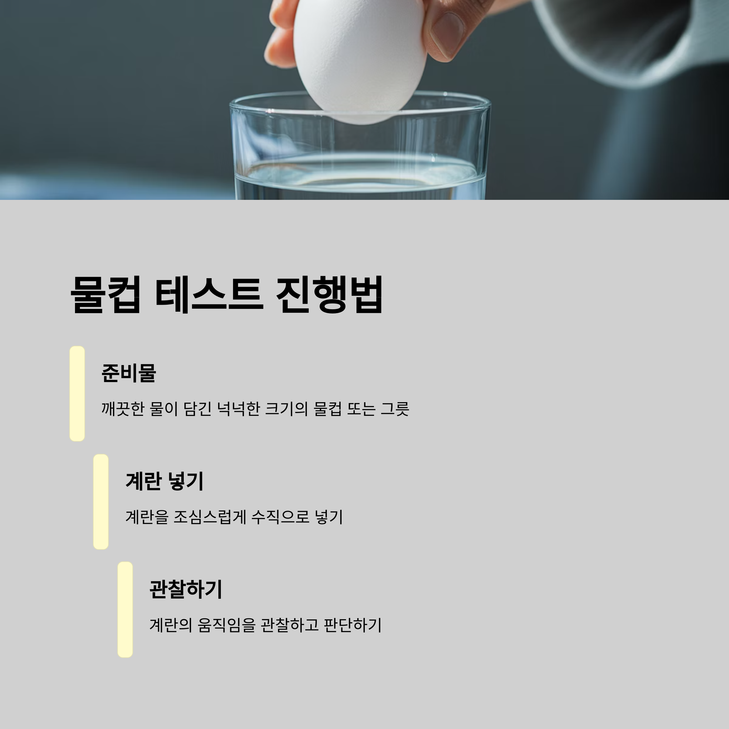 | 물에 뜬다 | 상한 계란 (3주 이상), 섭취 금지 |