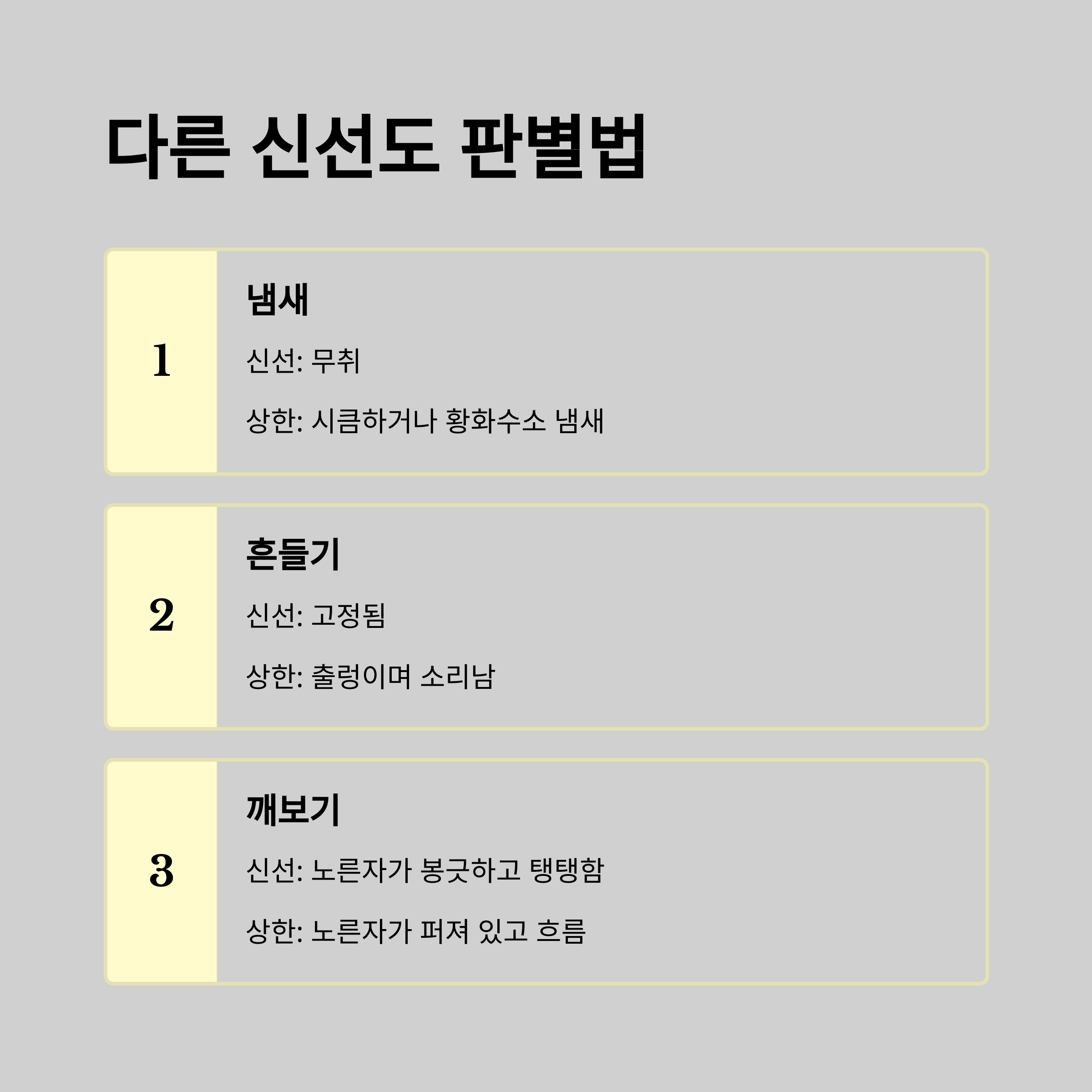 - 냄새: 시큼하거나 황화수소 냄새가 날 경우 폐기