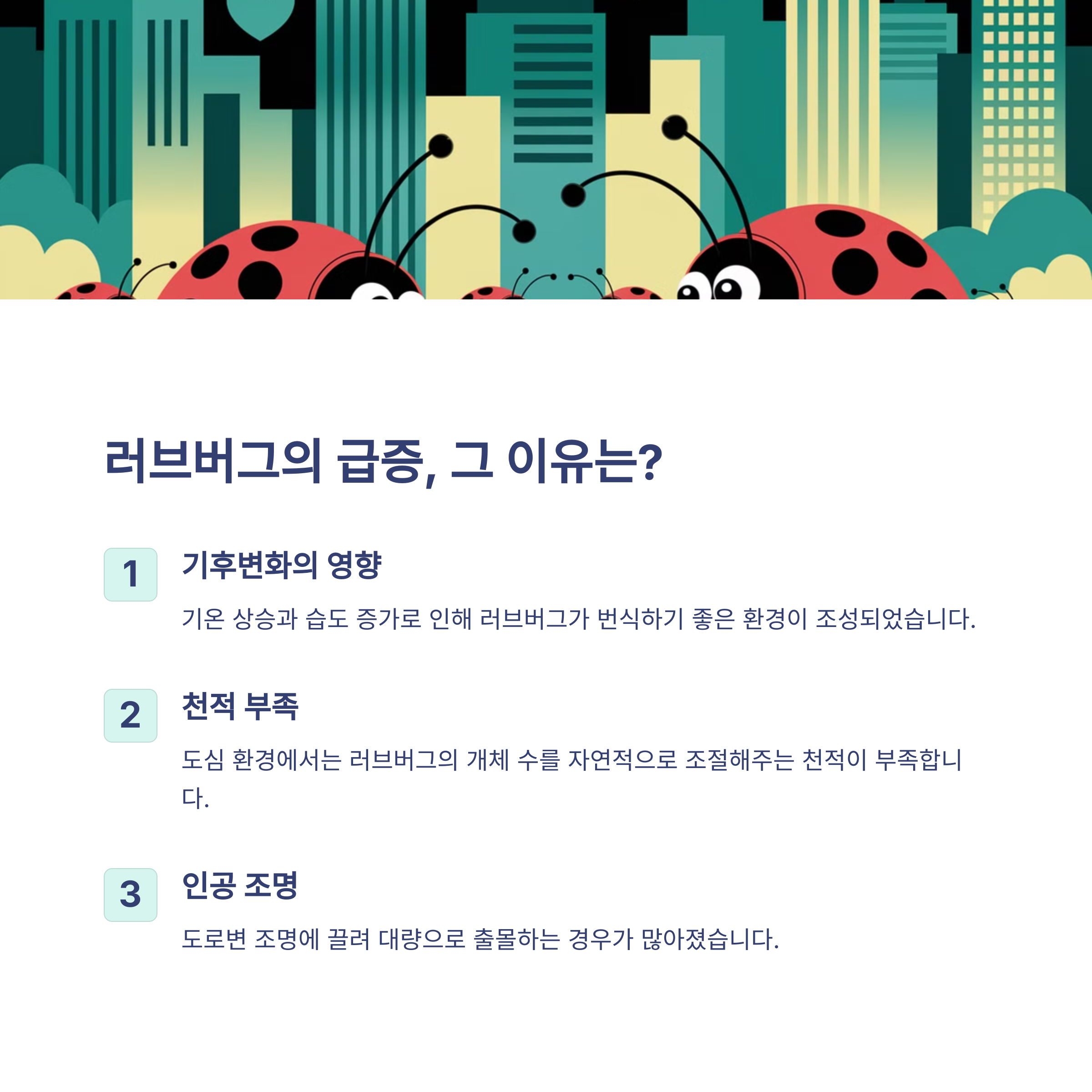| 화학 살충제 대신 자연 생태계를 활용한 방제 방법 적용 | 주민들이 직접 서식지 제거 및 피해 신고 가능 | 미국에서는 조명 조절을 통한 유입 감소 전략 활용 |