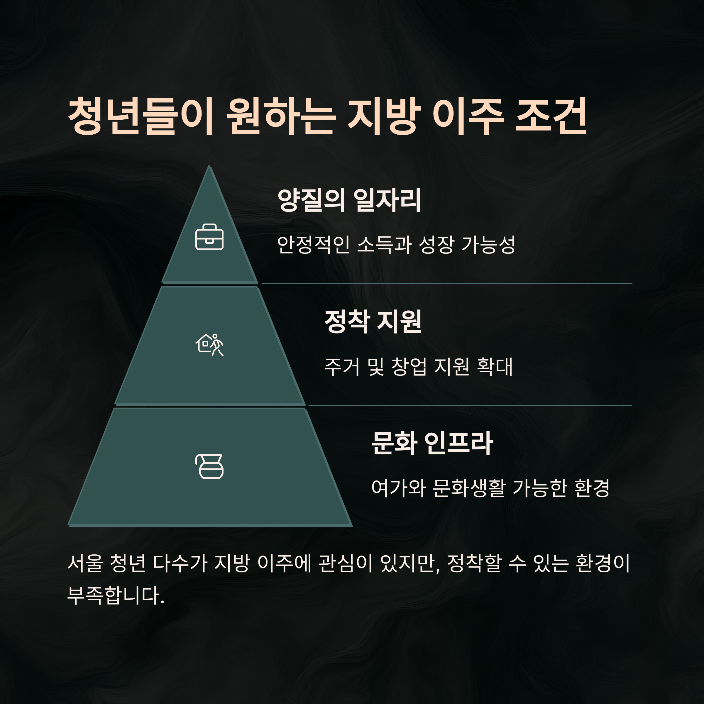 지방이 다시 살아나기 위해선 단지 청년 유입에 그쳐서는 안 됩니다. 그들이 머물고 싶고, 살아가고 싶은 곳이어야 하죠. 지속가능한 지역사회를 만들기 위해선 아래와 같은 요소들이 반드시 동반돼야 합니다.