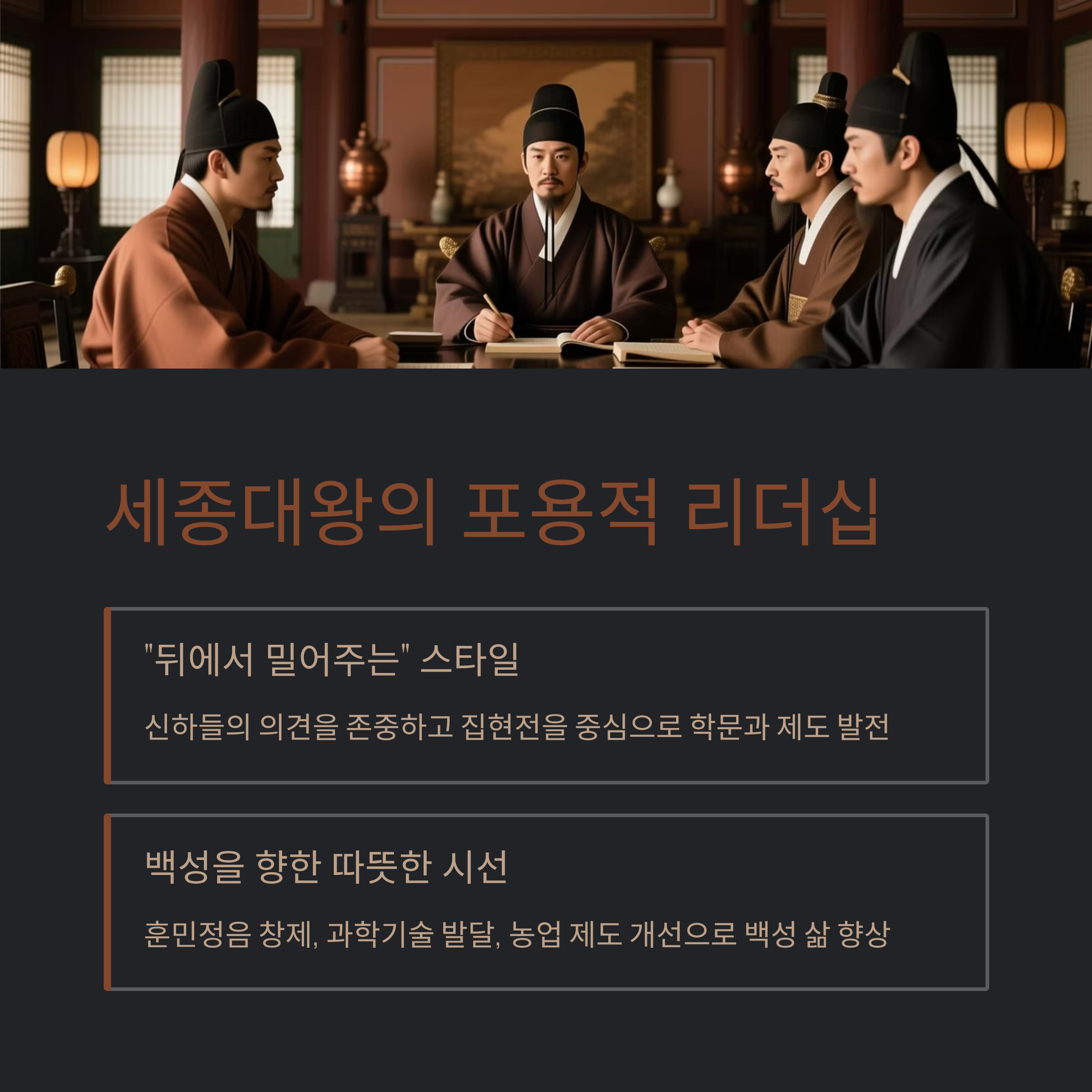 세종은 "뒤에서 밀어주는" 스타일의 정치로 신하들의 의견을 존중하고 집현전을 중심으로 학문과 제도를 발전시켰습니다. 훈민정음 창제, 과학기술 발달, 농업 제도 개선은 모두 백성을 향한 따뜻한 시선에서 비롯된 성과였습니다.