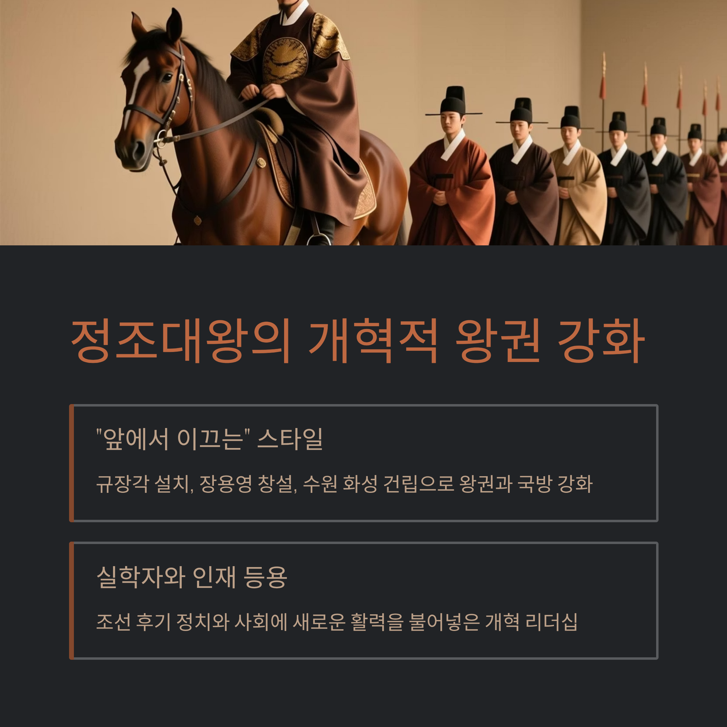 정조는 "앞에서 이끄는" 스타일을 선택했습니다. 규장각 설치, 장용영 창설, 수원 화성 건립 등으로 왕권과 국방을 강화하면서도 실학자와 인재를 적극 등용했습니다. 이는 조선 후기 정치와 사회에 새로운 활력을 불어넣었습니다.