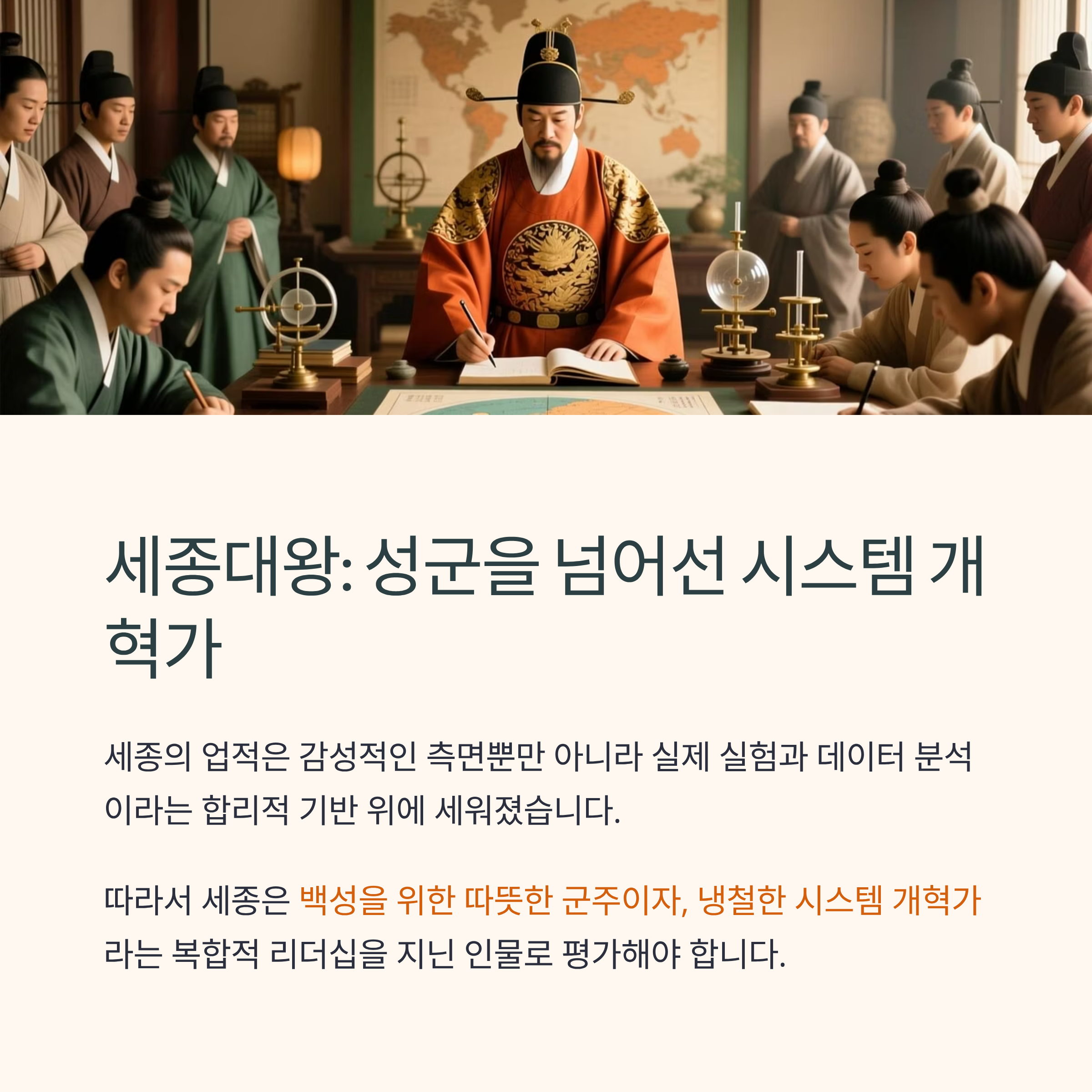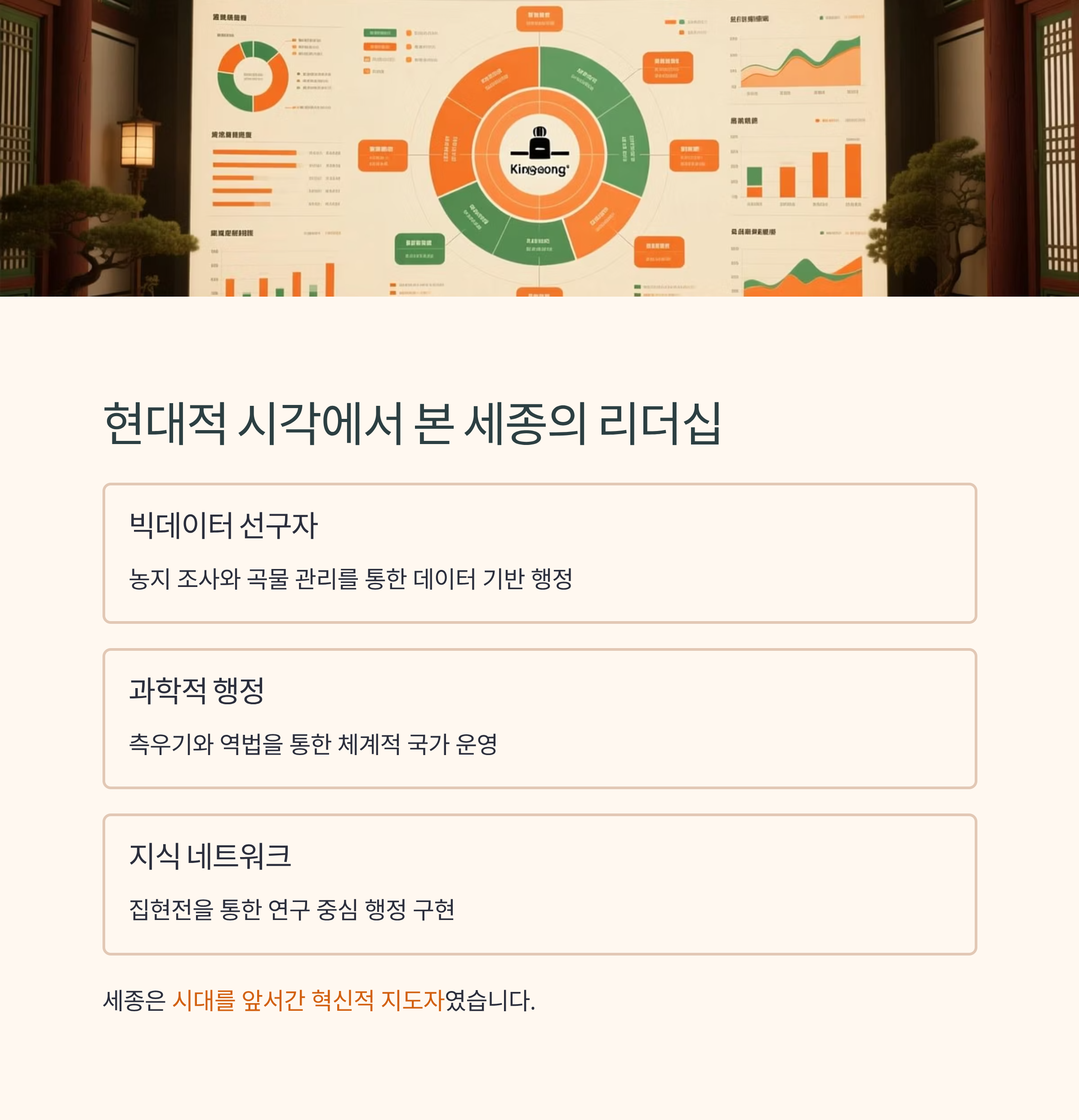 따라서 세종은 백성을 위한 따뜻한 군주이자, 냉철한 시스템 개혁가라는 복합적 리더십을 지닌 인물로 평가해야 합니다.