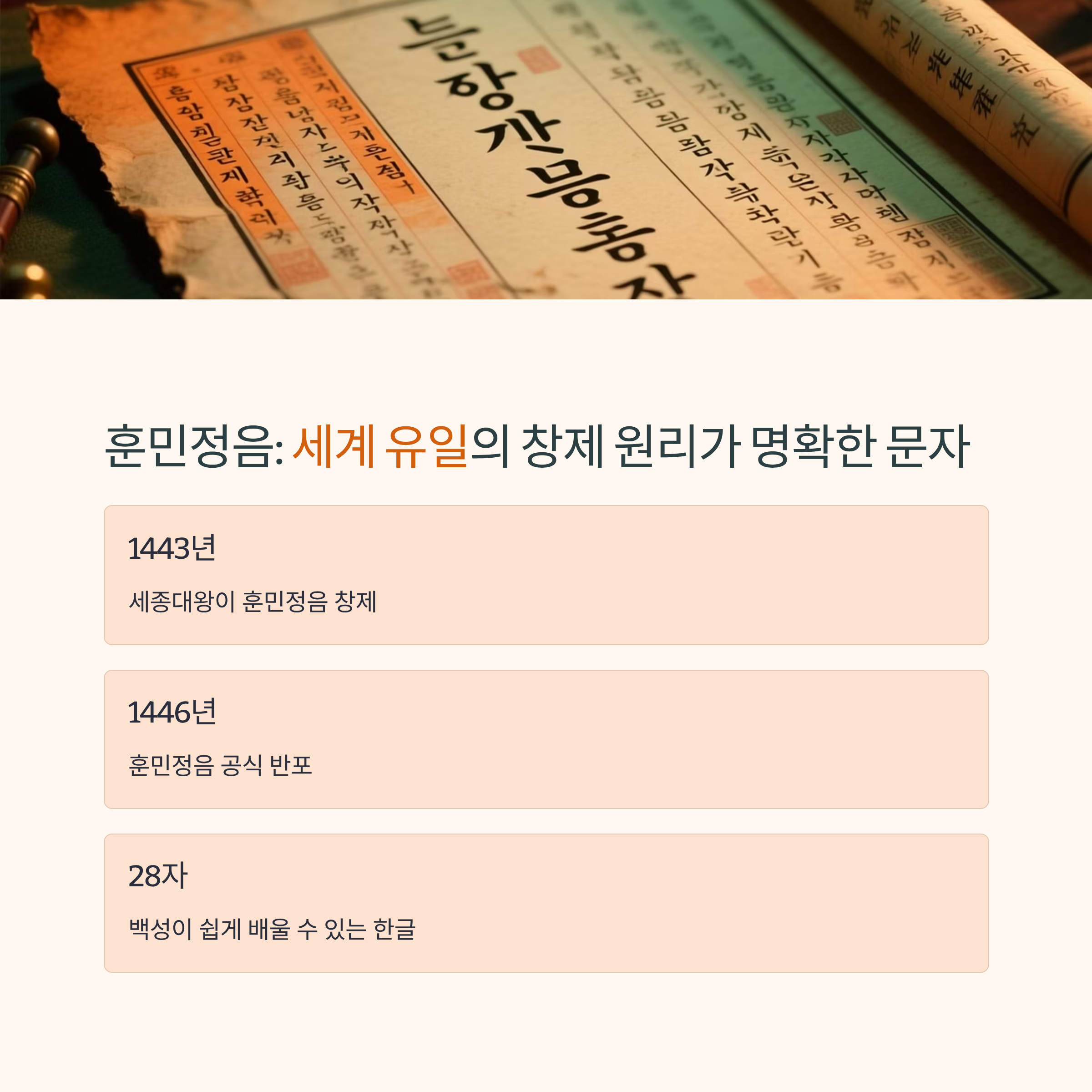 28자의 한글은 백성이 쉽게 배울 수 있도록 설계되었으며, 창제 원리와 창제자가 명확한 세계적으로 유일한 문자입니다. 문자학과 언어학에서 큰 혁신으로 평가받으며, 문자 사용의 독점성을 깬 사례이기도 합니다.