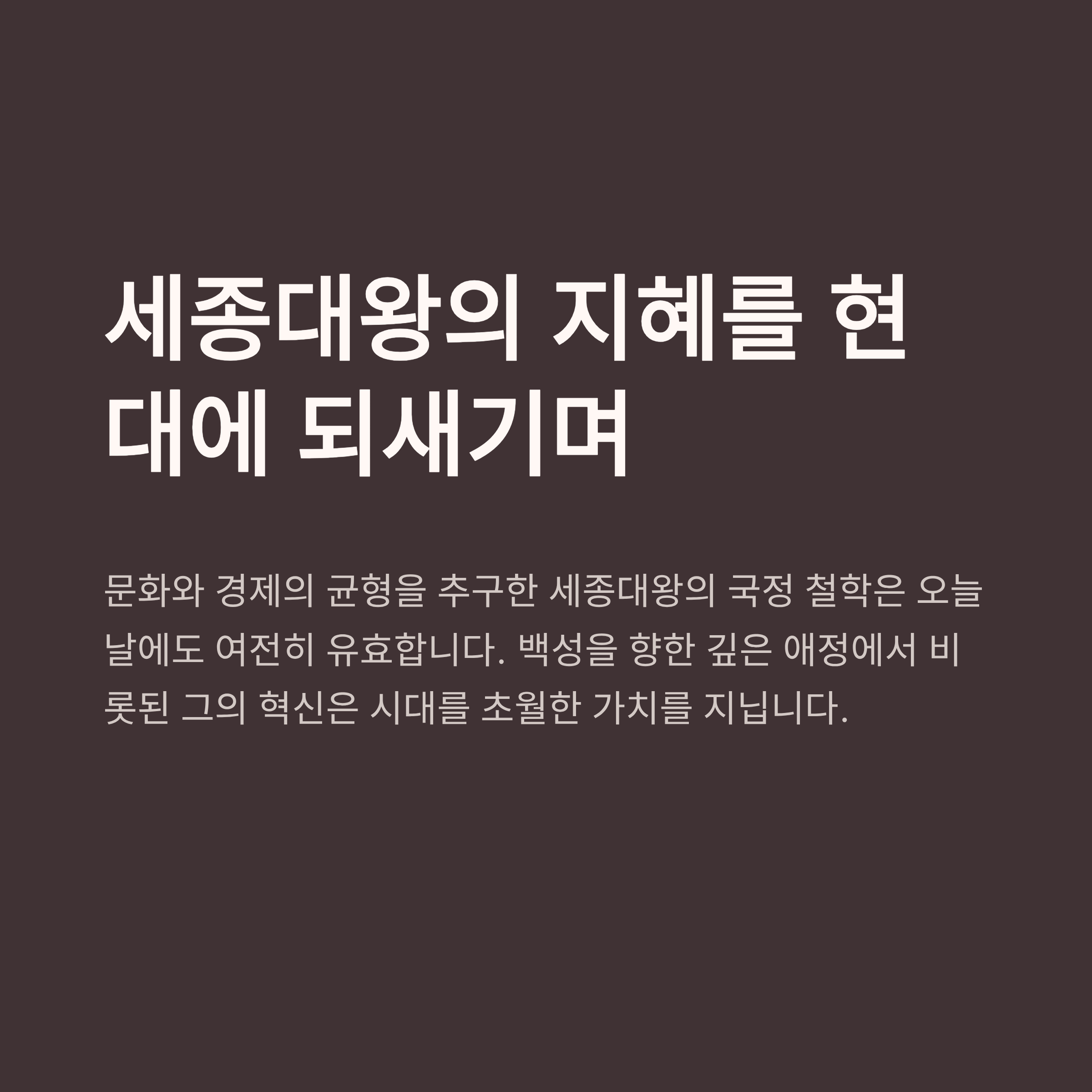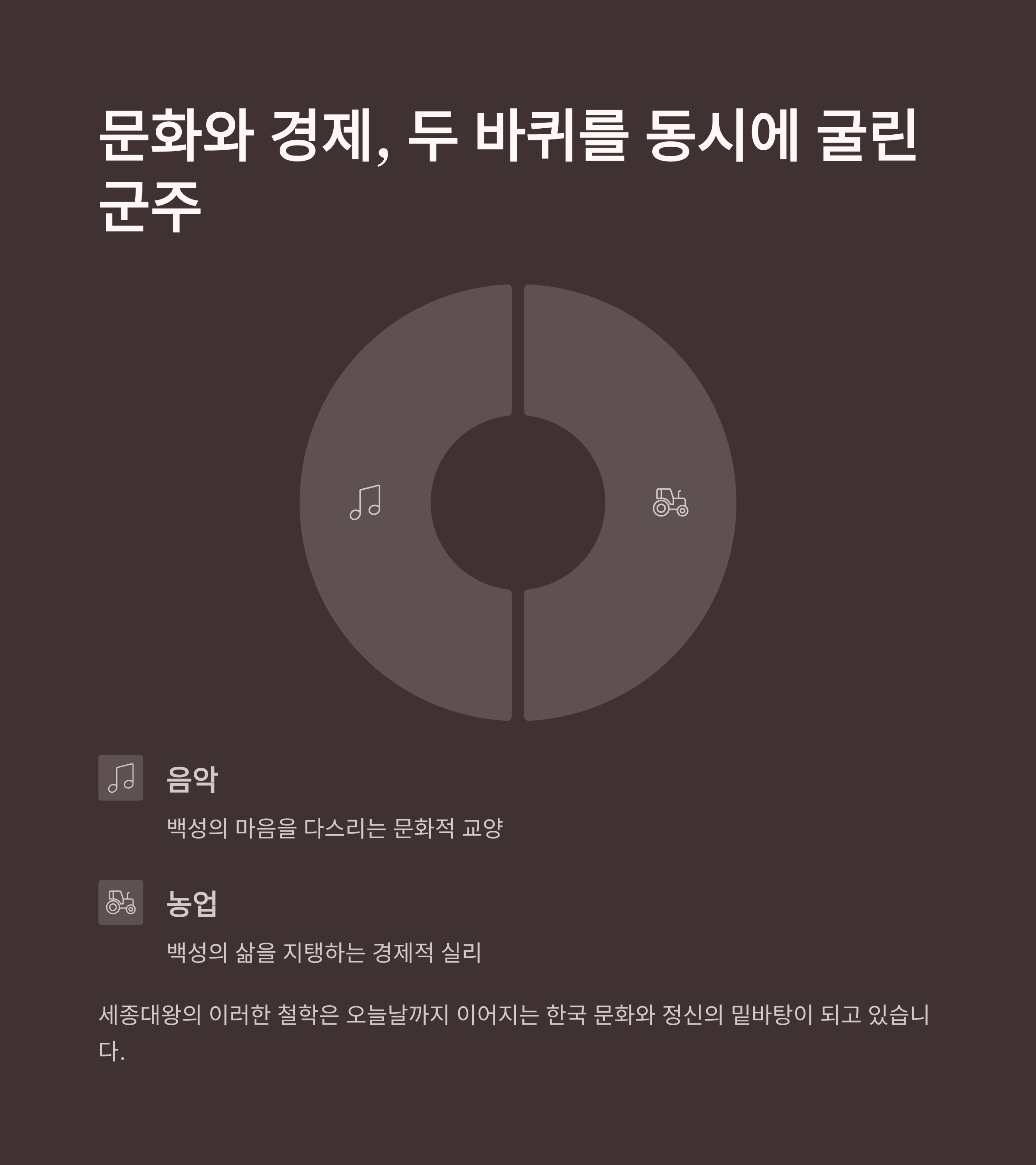 세종대왕은 문화적 교양과 경제적 실리를 동시에 추구한 보기 드문 리더였습니다. 음악으로 백성의 마음을 다스리고, 농업으로 그들의 삶을 지탱하며 조선을 안정적인 국가로 만들었습니다. 그의 이러한 철학은 단지 당시 조선에 그치지 않고, 오늘날까지 이어지는 한국 문화와 정신의 밑바탕이 되고 있습니다.