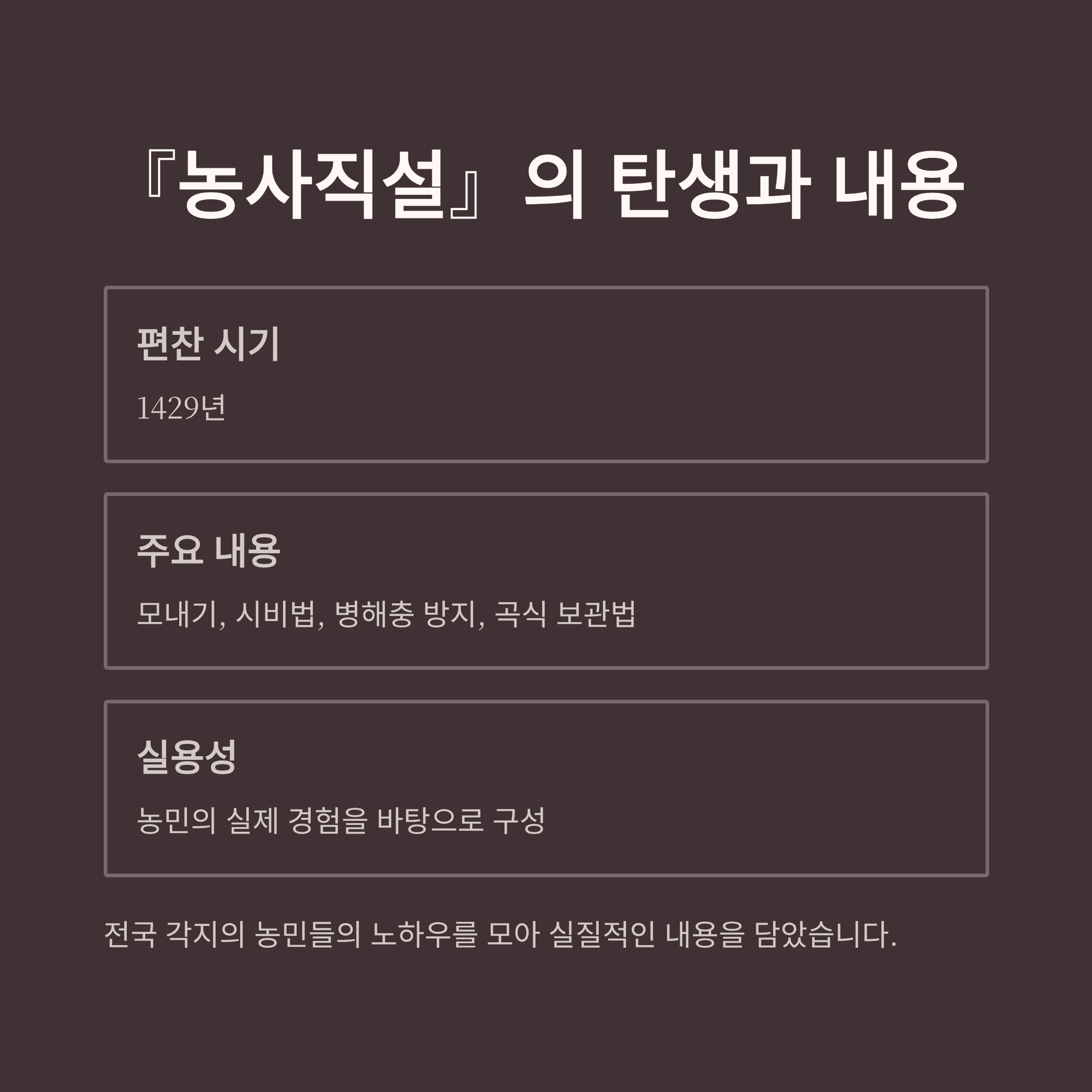 세종은 단순히 책을 만드는 데 그치지 않고, 전국 각지에서 농민들의 실제 농사 경험과 지역별 노하우를 모아 반영했습니다. 그 결과, 모내기, 논밭 가는 법, 병해충 방지법, 시비법 등 실질적인 내용이 풍부하게 담기게 되었습니다.