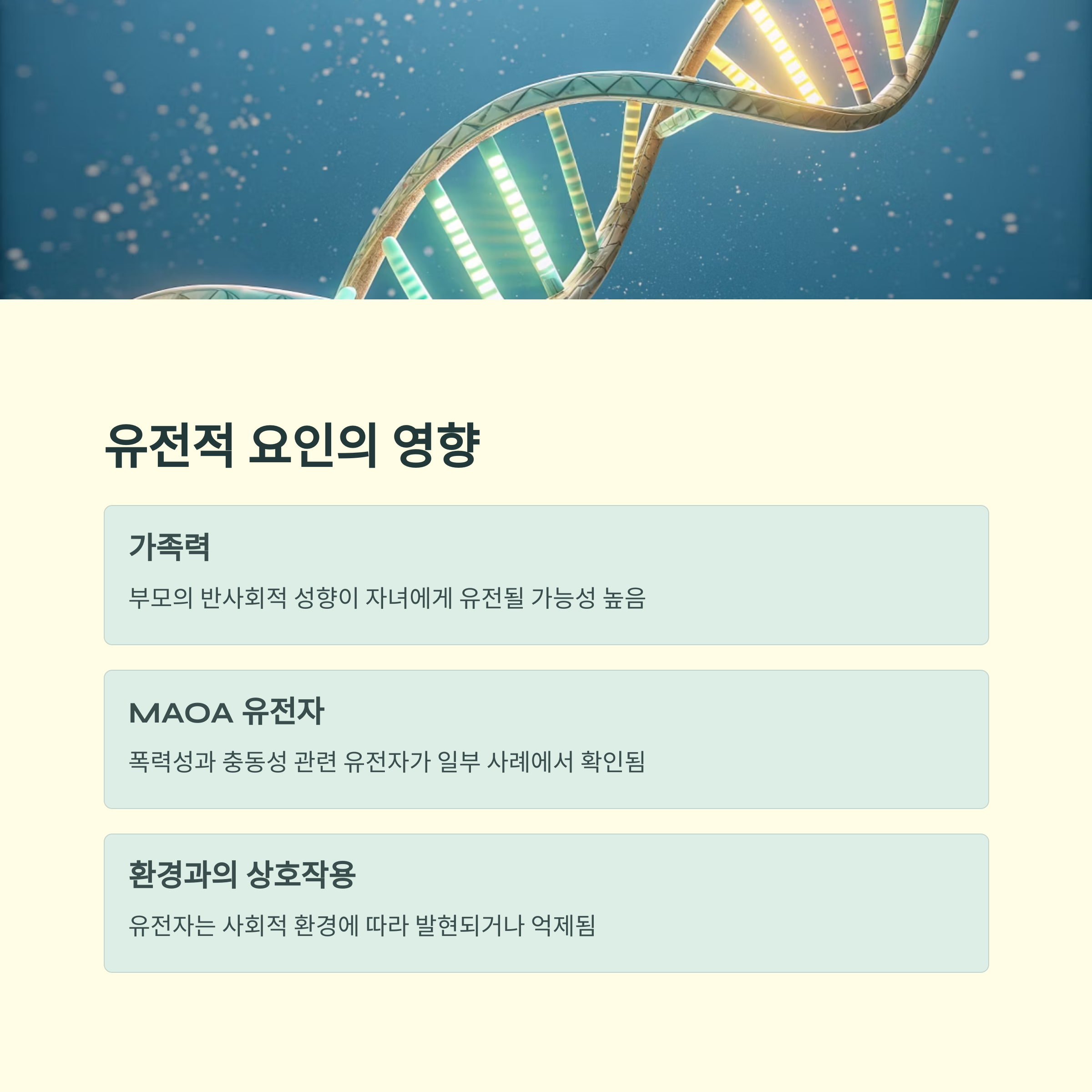 이런 유전자는 사회적 환경에 따라 발현되기도, 억제되기도 하기에 더욱 주의가 필요합니다.