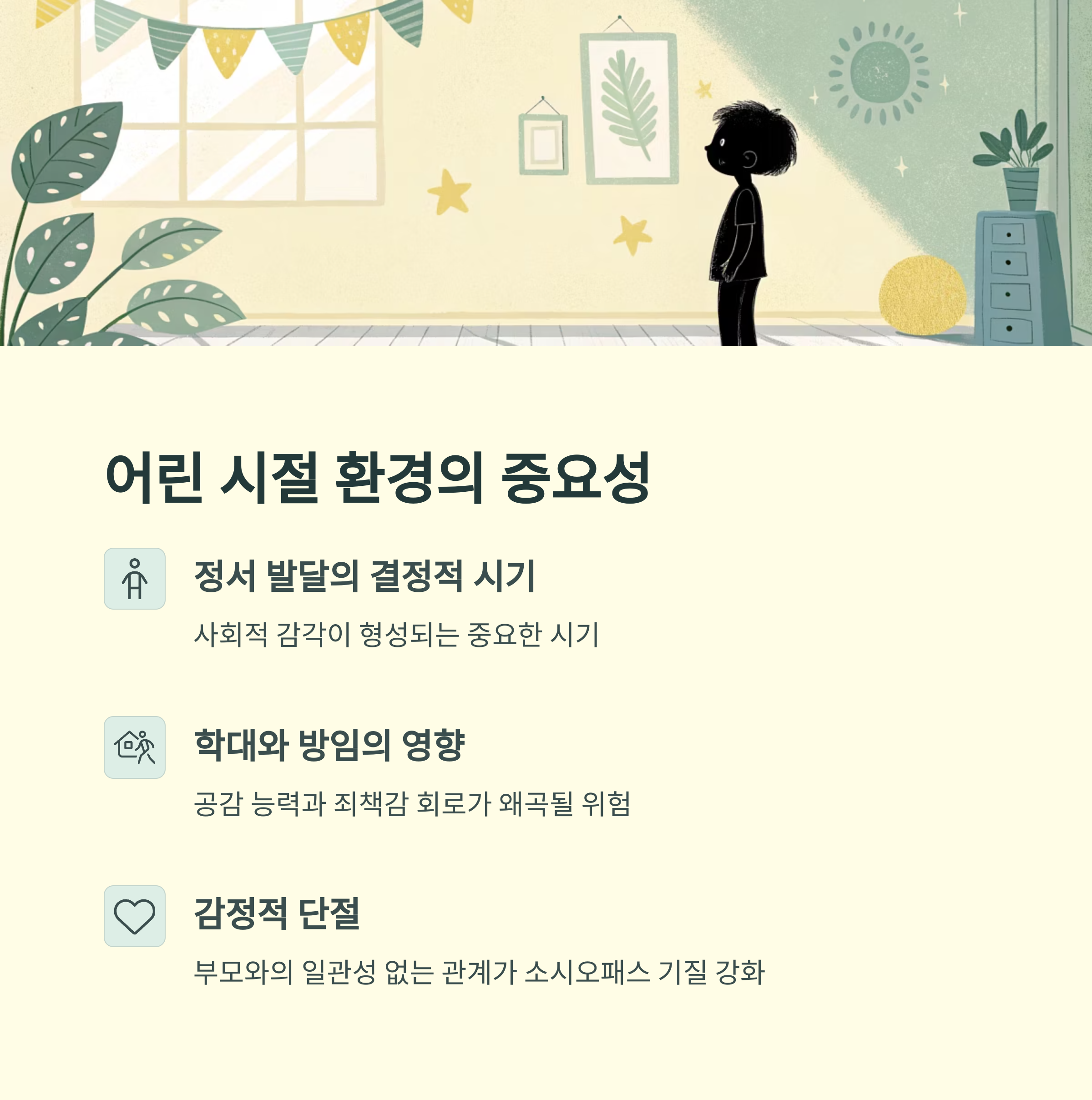 유년기에 학대나 방임, 반복된 가정 폭력 등을 경험한 경우 공감 능력과 죄책감 회로가 왜곡될 위험이 큽니다.