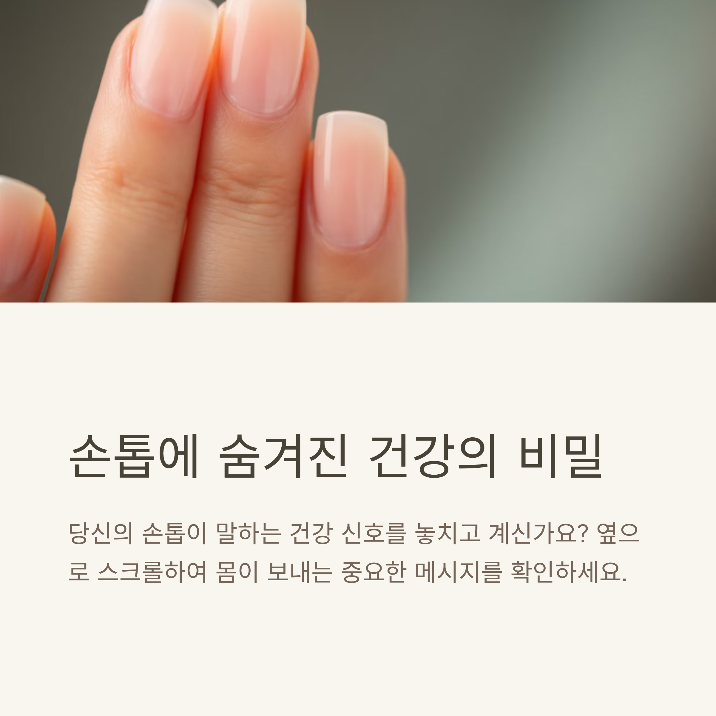 손톱은 단순한 미용 요소가 아닌, 우리의 건강 상태를 미리 경고해주는 자연의 알림 시스템입니다. 손끝에서 전해지는 작은 변화들이 큰 질병의 징후일 수 있음을 항상 기억해야 합니다. 특히 성장 속도, 색상, 표면 변화 등은 단순한 변덕이 아닌 중요한 건강 신호일 수 있습니다. 이번 글을 통해 손톱을 더 깊이 이해하고, 건강을 지키는 습관으로 연결되기를 바랍니다. 내 몸이 보내는 신호를 민감하게 받아들이고, 조기에 대처할 수 있는 지혜를 가지는 것이야말로 건강을 위한 첫걸음입니다.