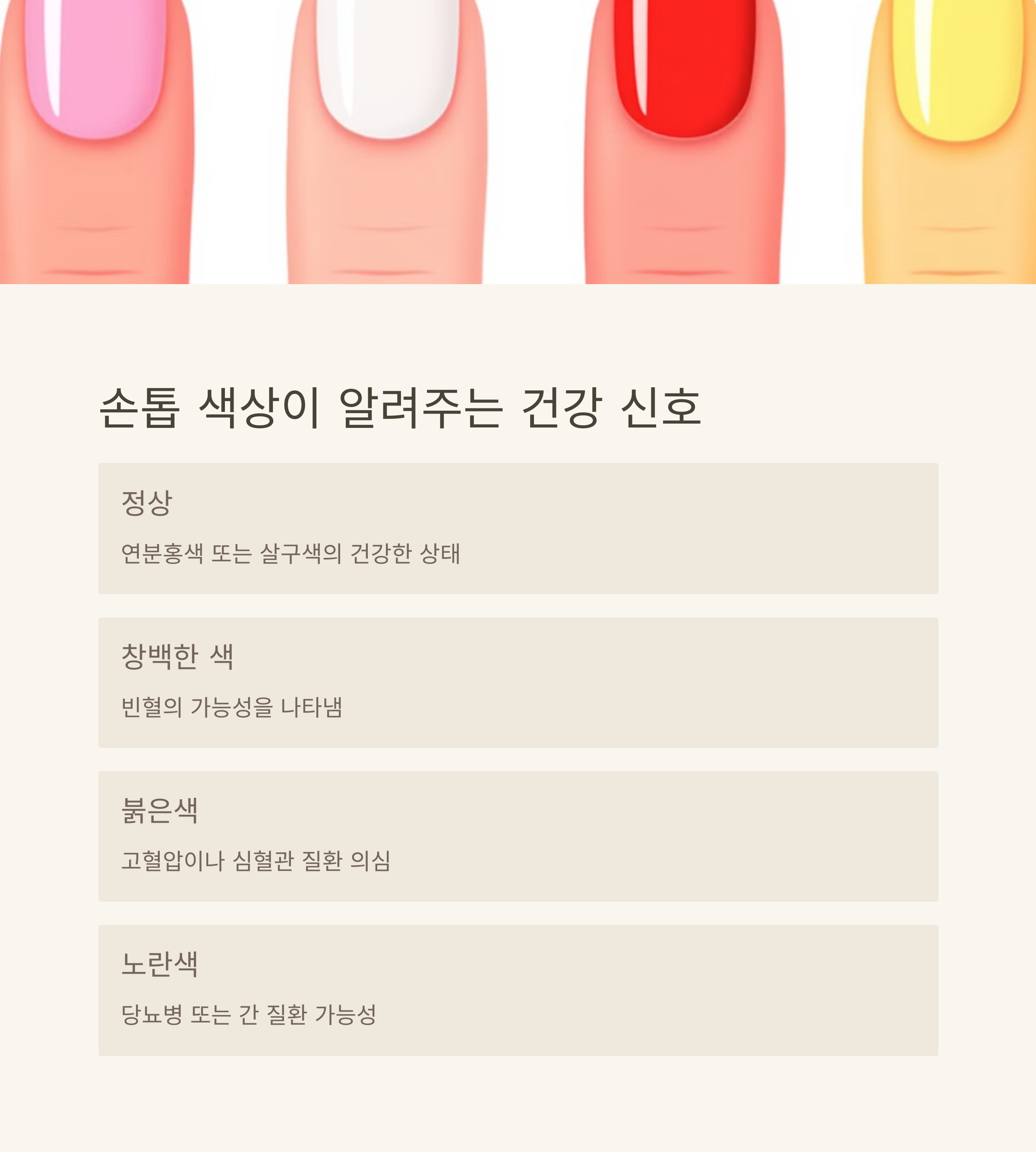 | 손톱 색상 변화 | 색상 변화는 내과적 질환이나 영양 결핍을 의미할 수 있습니다. |