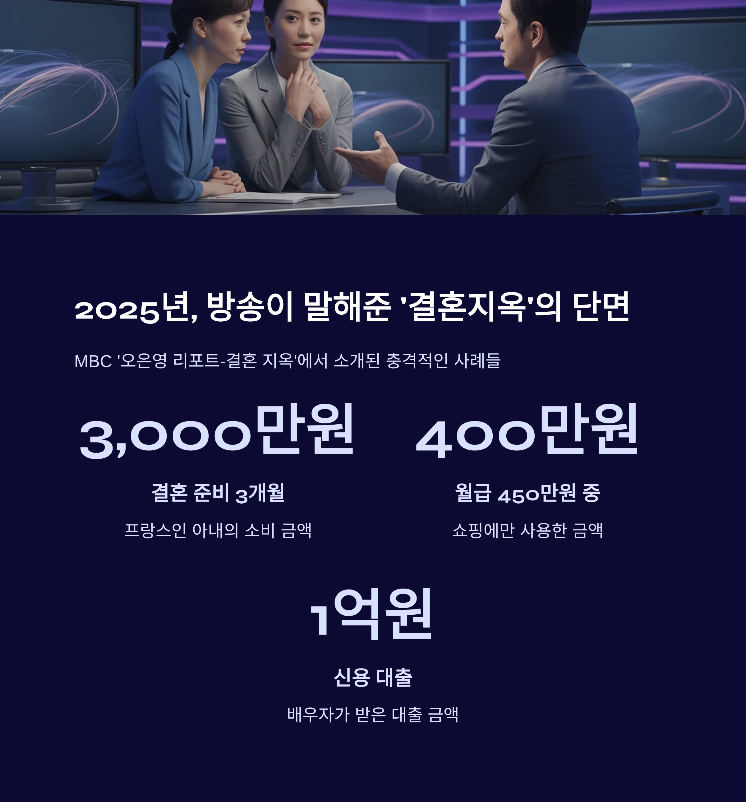 2025년 9월 MBC ‘오은영 리포트-결혼 지옥’에서는 프랑스인 아내가 결혼 준비 3개월 동안 약 3,000만 원을 사용하며, 통장 잔고가 수천 원 수준일 때도 소비를 멈추지 않았던 사례가 소개되었습니다.