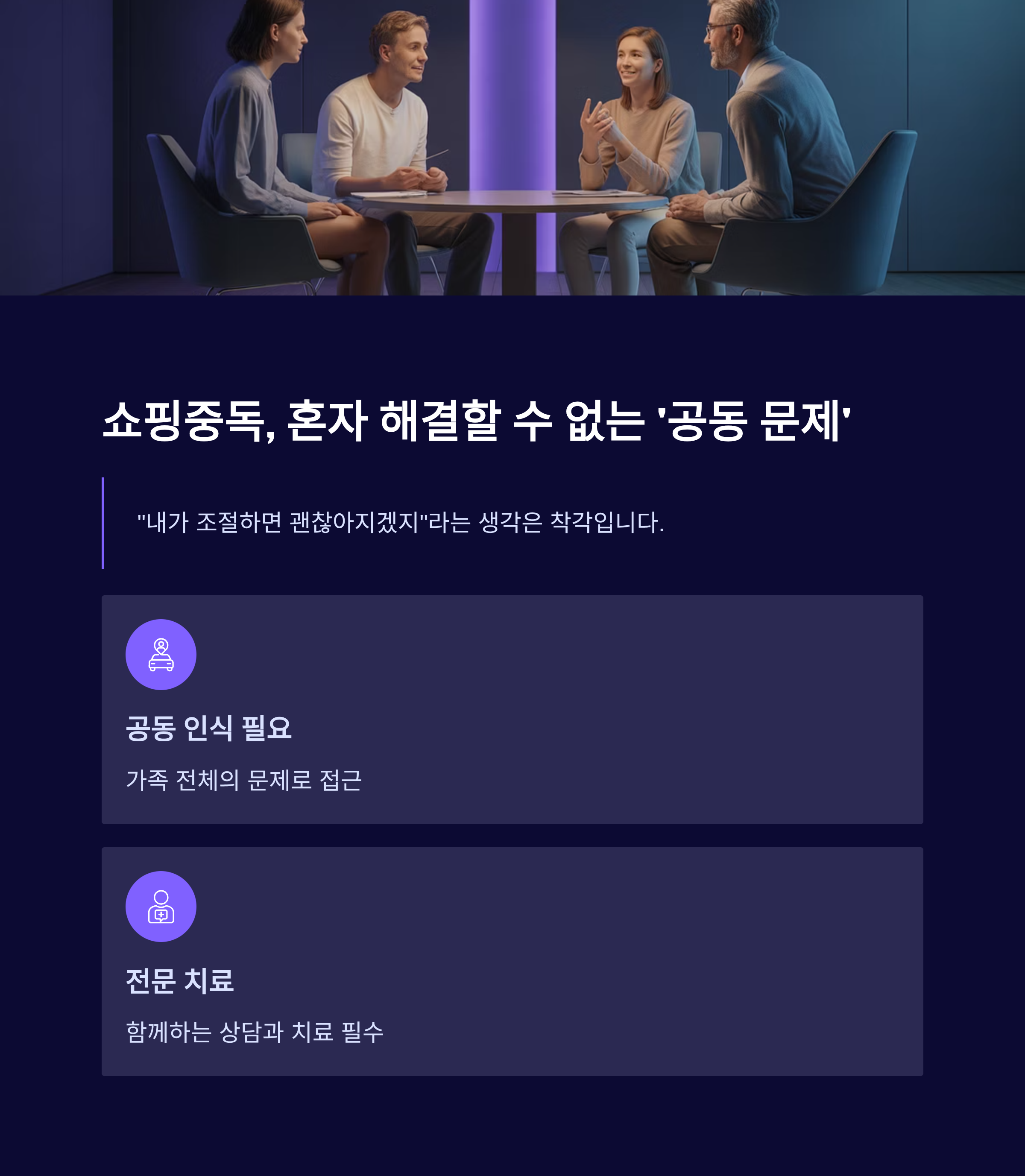 많은 사람들이 "내가 조절하면 괜찮아지겠지"라고 생각하지만, 실제로 쇼핑중독은 개인 혼자의 노력으로 개선되기 어렵습니다.