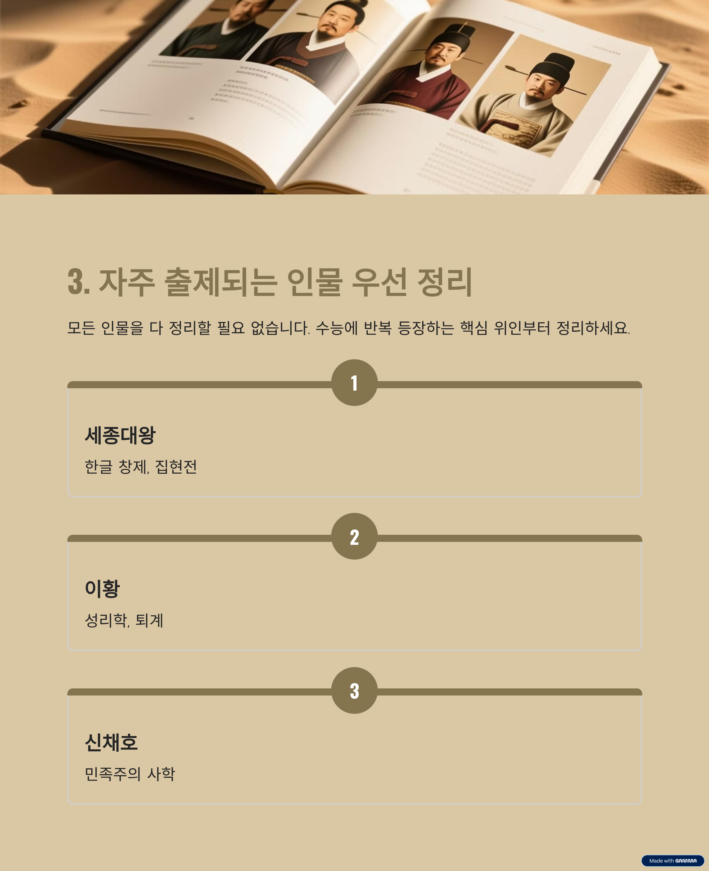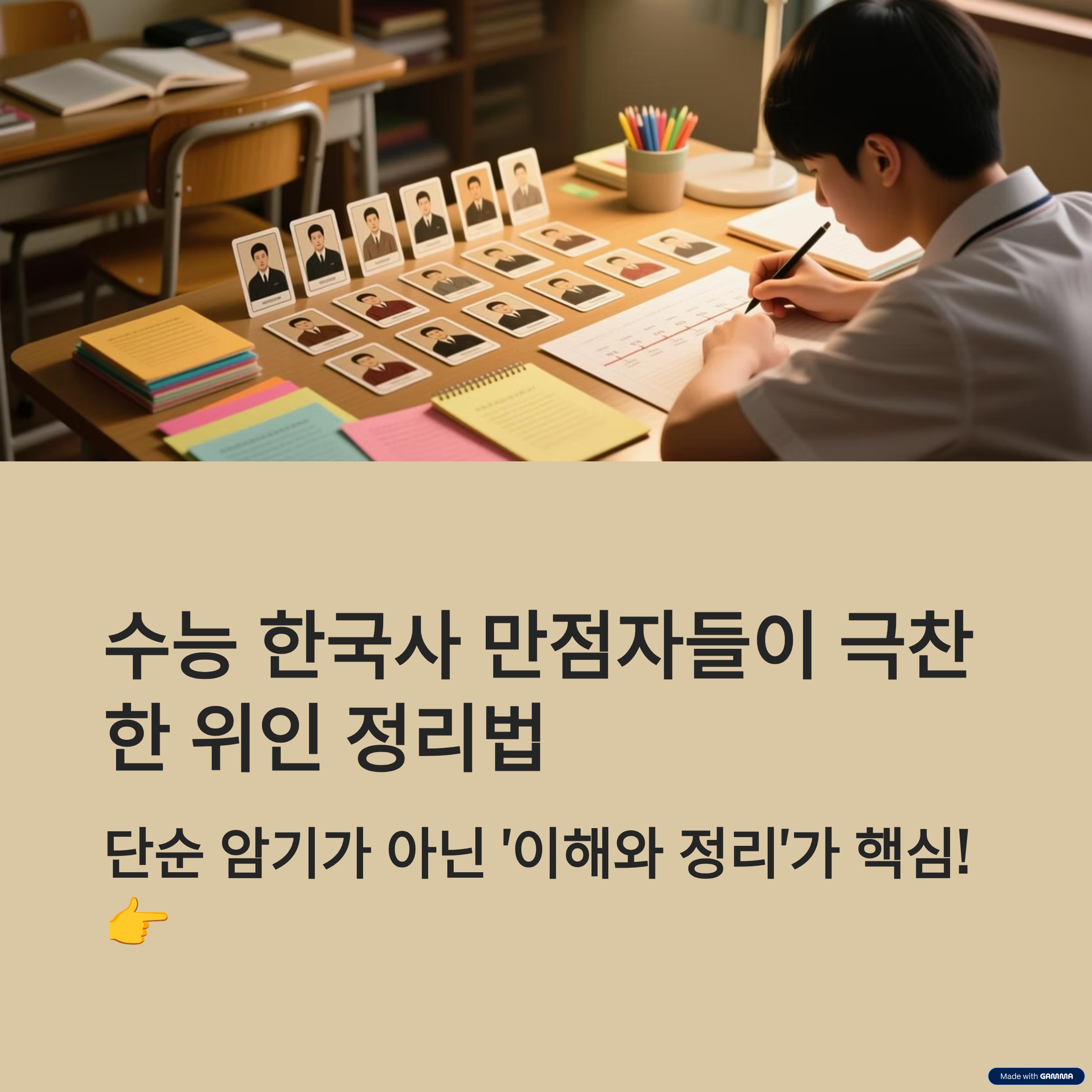 수능 한국사에서 고득점을 목표로 하는 학생이라면 위인 정리는 필수 중의 필수입니다. 단순히 연도와 업적만 외우는 시대는 끝났습니다. 실제 만점자들이 공통으로 말하는 핵심은 ‘스토리 흐름 속 위인 배치’와 ‘반복 학습이 아닌 뇌에 각인시키는 방식’입니다. 이번 글에서는 한국사 만점자들이 실전에서 써먹은 위인 정리 노하우를 구체적으로 공개합니다.