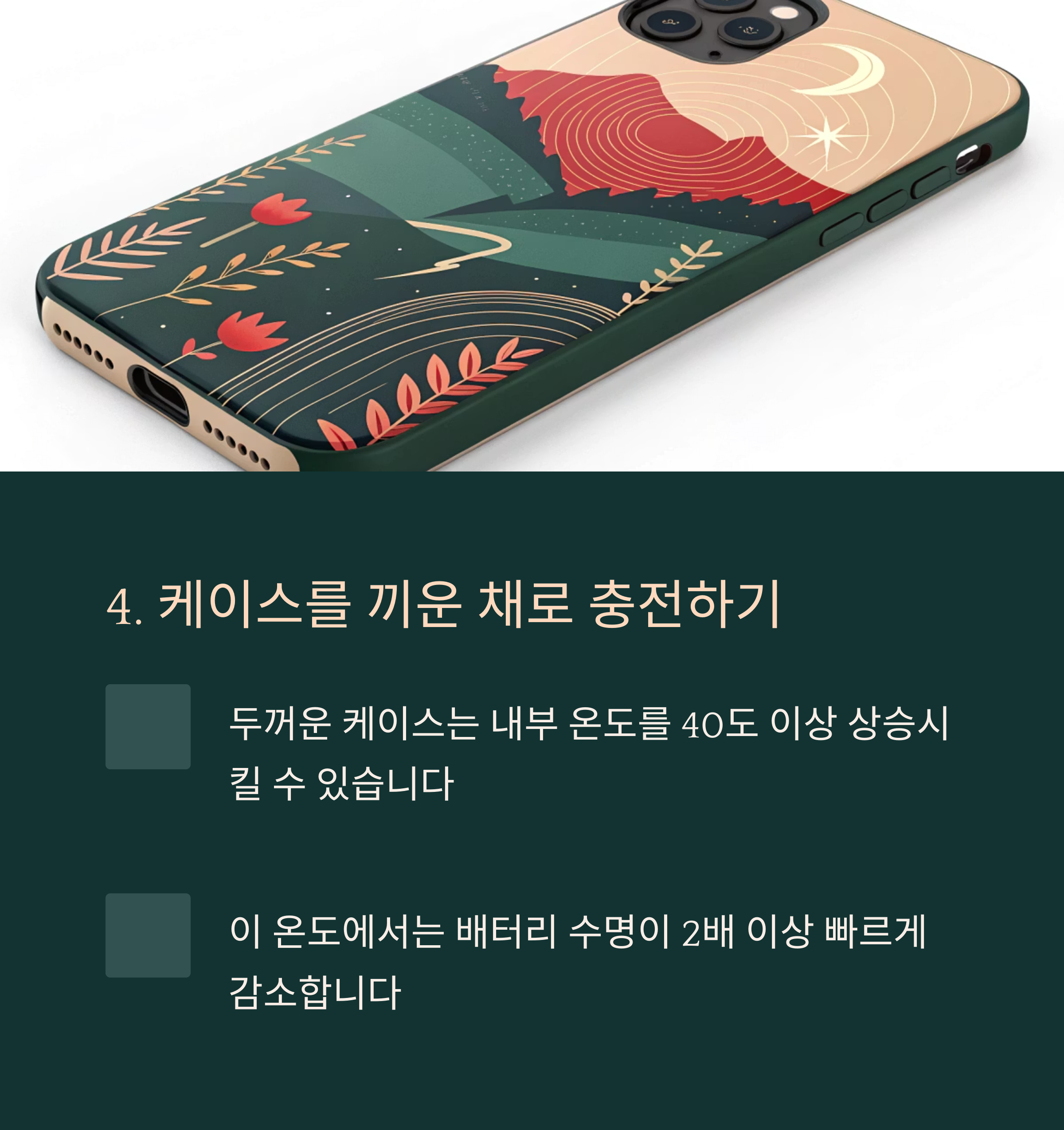 하지만 두꺼운 케이스를 끼운 채로 충전하면 발열이 갇혀 내부 온도가 40도 이상 상승할 수 있습니다.