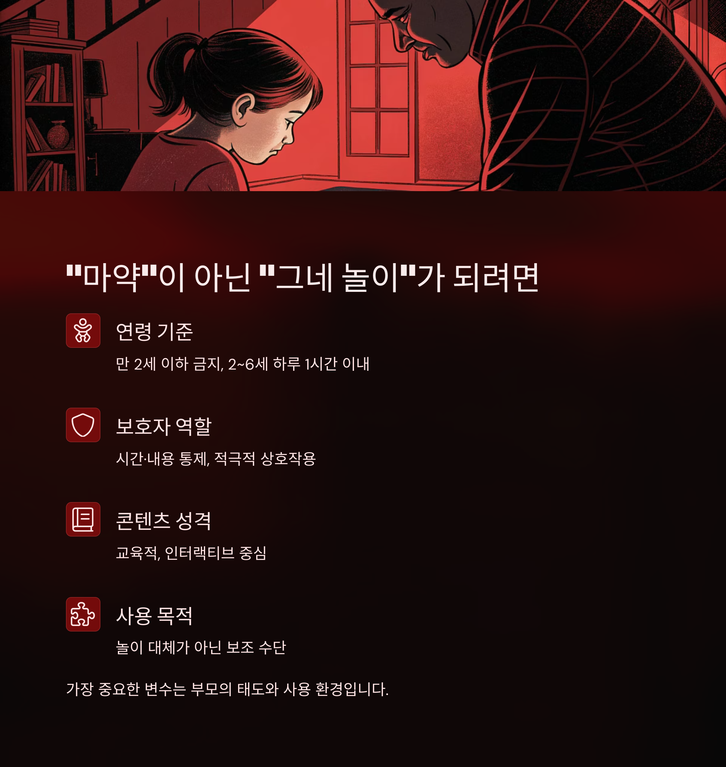 | 보호자 역할 | 시간·내용 통제, 적극적 상호작용 |