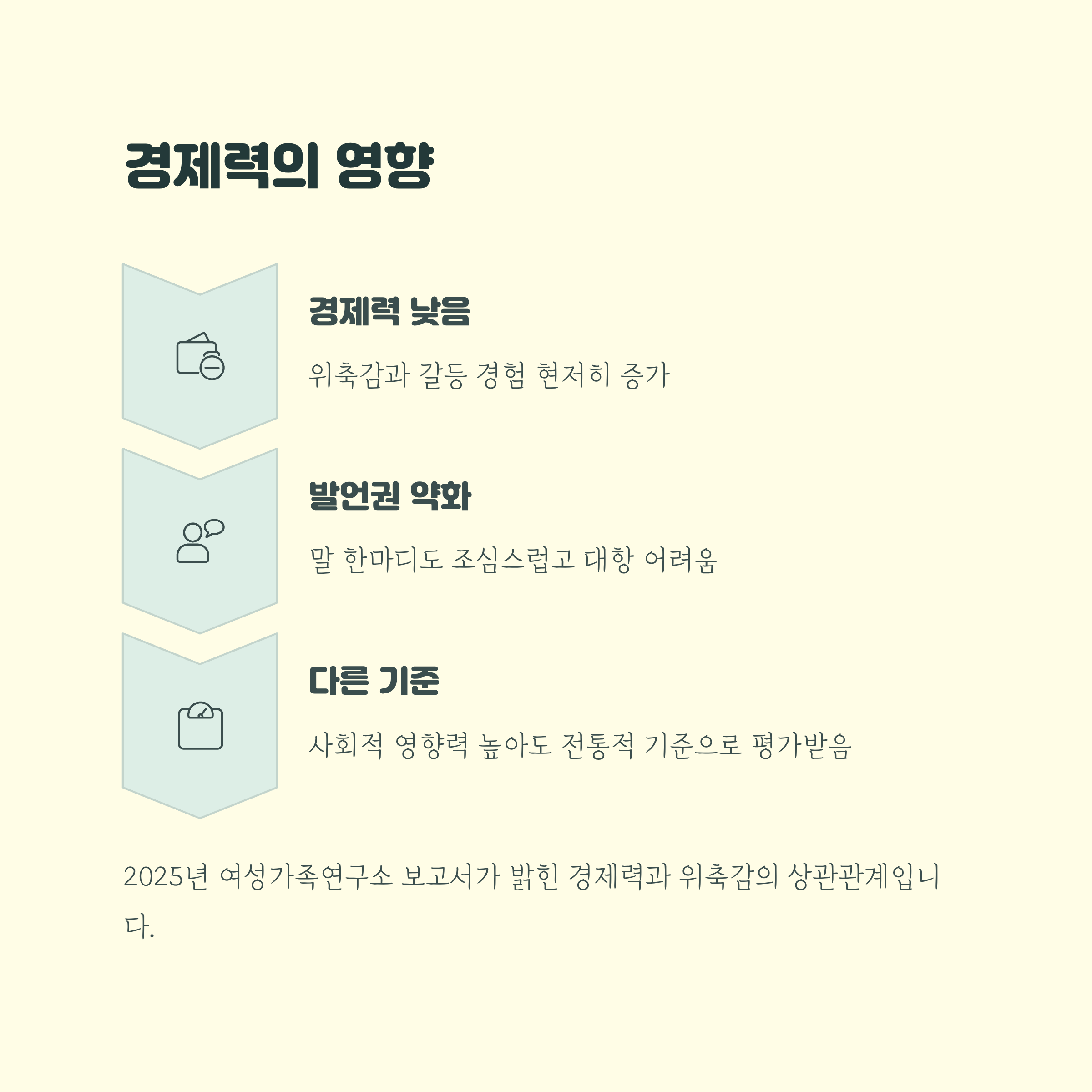 2025년 여성가족연구소 보고서에 따르면, 며느리의 경제력이 낮을수록 시댁에서 겪는 위축감과 갈등 경험이 현저히 높아지는 것으로 나타났습니다.