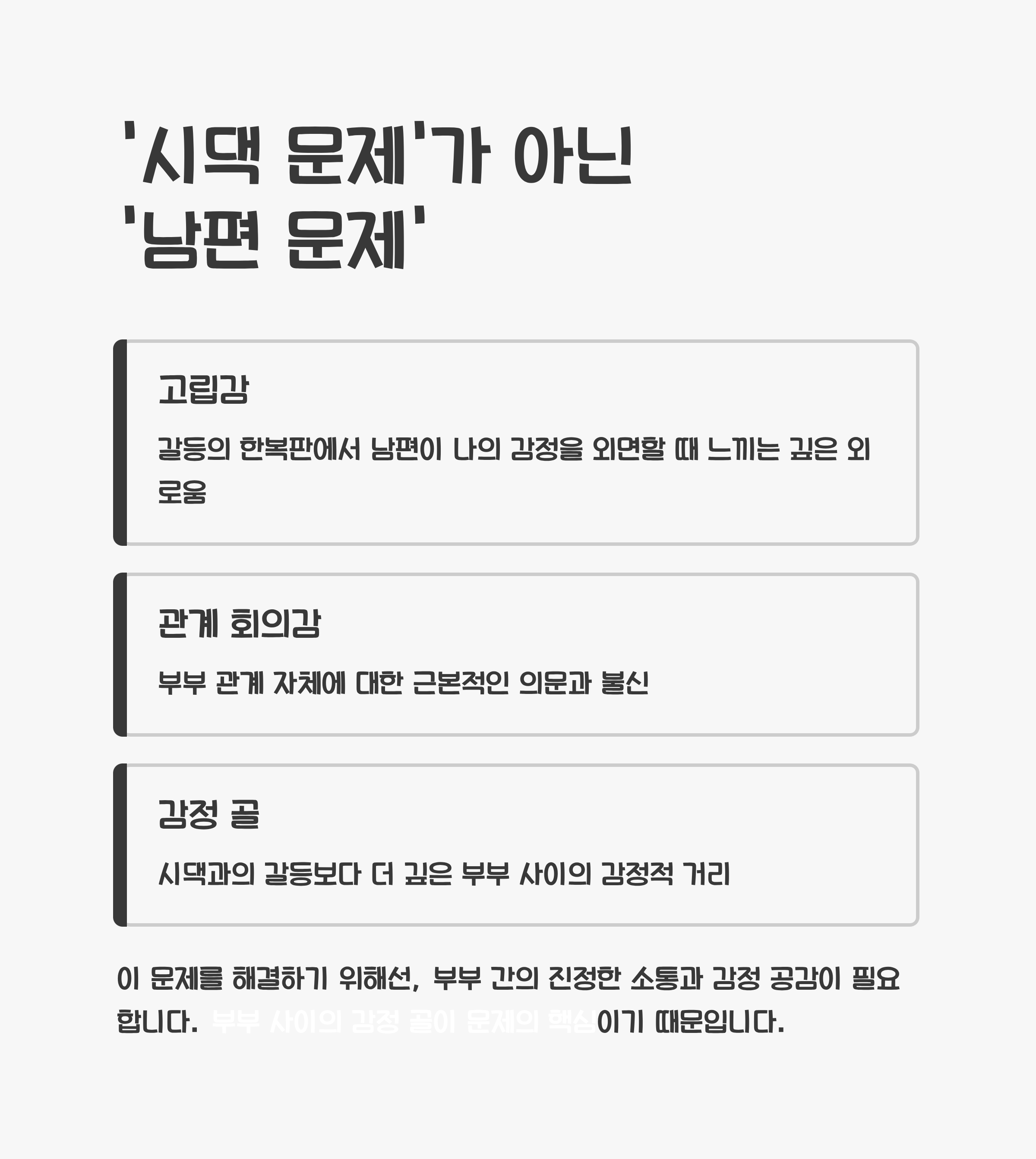 시댁과의 갈등보다 더 깊은, 부부 사이의 감정 골이 문제의 핵심이기 때문입니다.