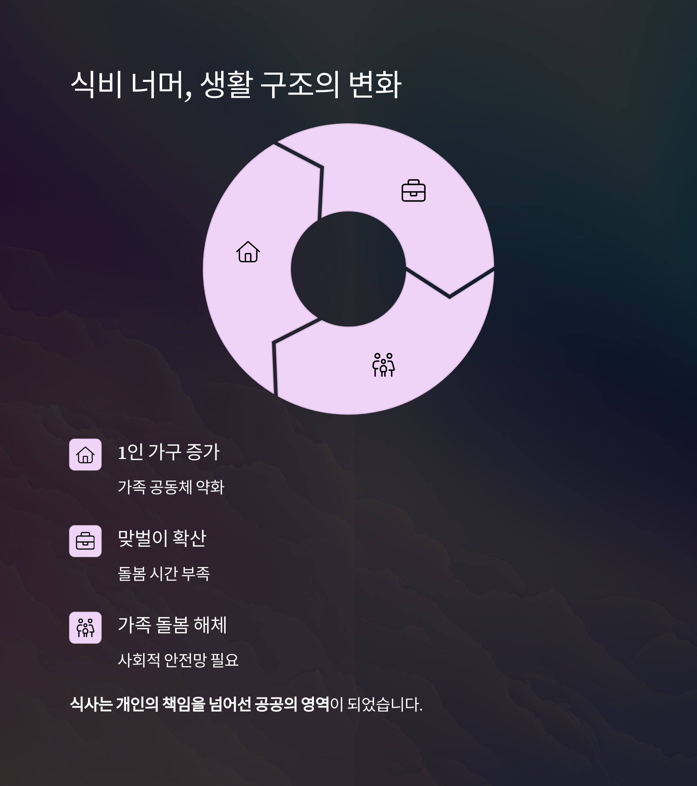 1인 가구 증가, 맞벌이 확산, 가족 돌봄 구조의 해체가 복합적으로 작용하고 있습니다.