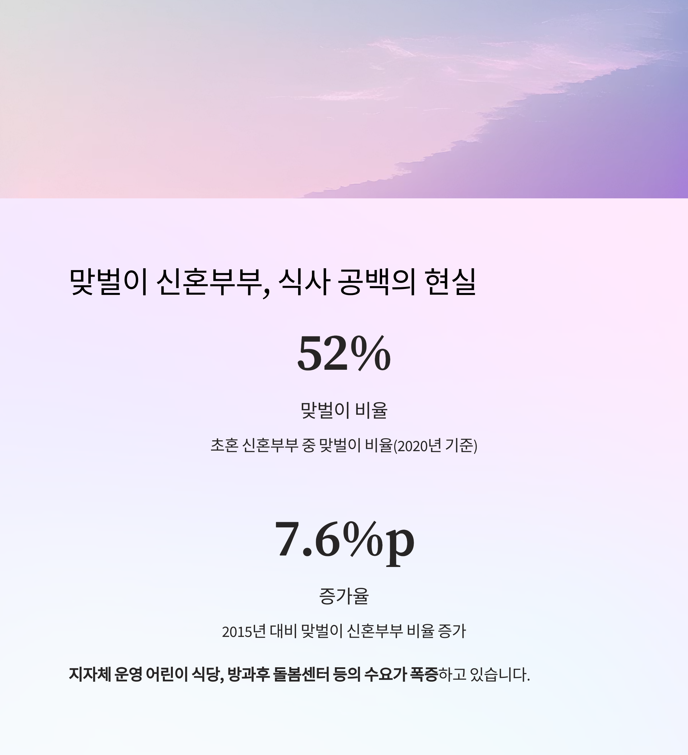 | 맞벌이 증가 | 신혼부부 절반 이상 맞벌이, 돌봄 공백 심화 |