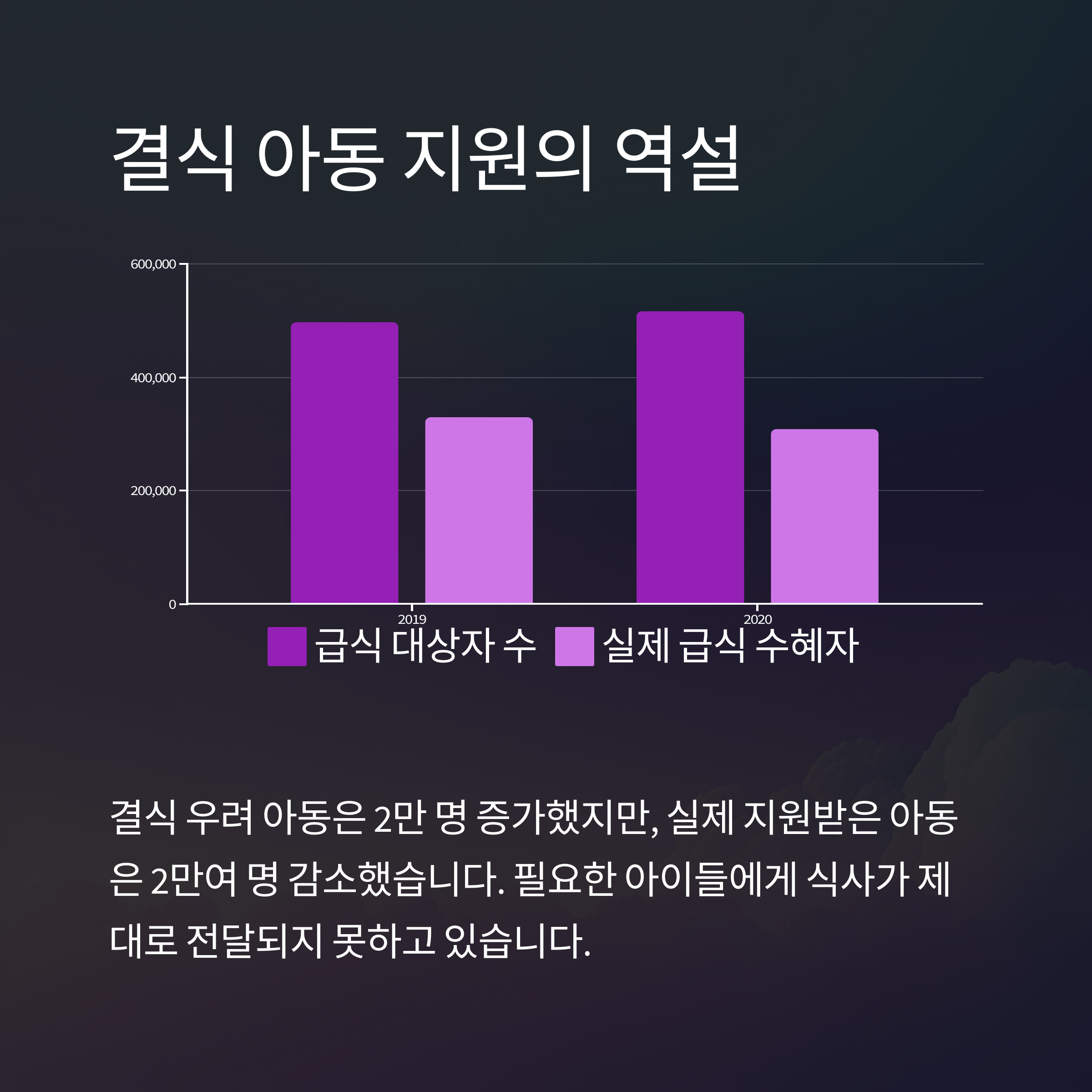 2019년에서 2020년 사이, 결식 우려 아동 급식 지원 대상자는 약 2만 명 증가했습니다.