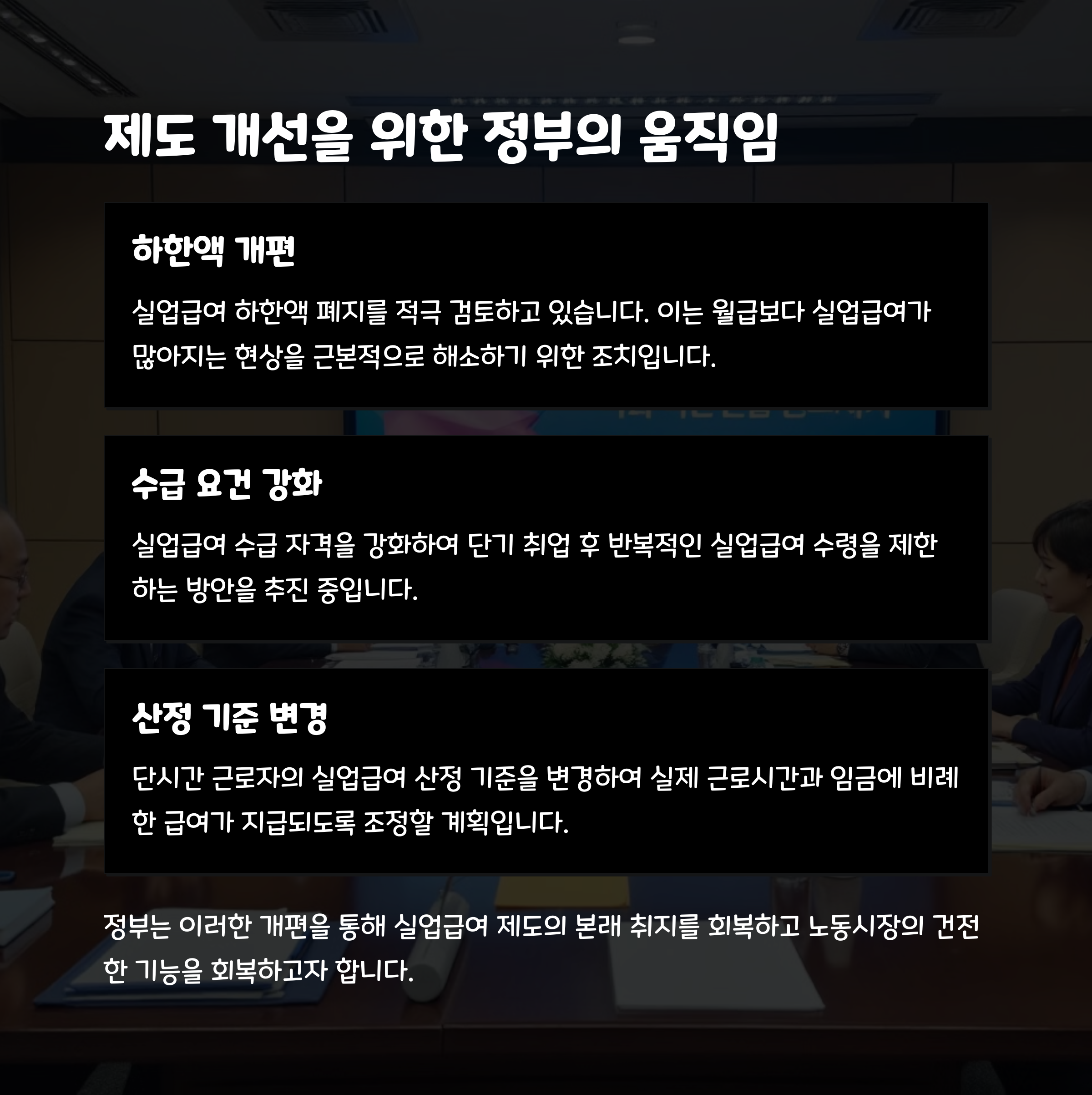 정부도 이 문제를 인지하고 실업급여 제도 개편안을 마련 중이에요. 핵심은 실업급여 하한액을 없애고, 수급 요건을 강화해 실업급여가 ‘의도적인 선택’이 되지 않도록 하는 거예요. 단순히 ‘받기 쉬운 돈’이 아닌 ‘필요한 사람을 위한 제도’로 재정립하자는 취지죠.