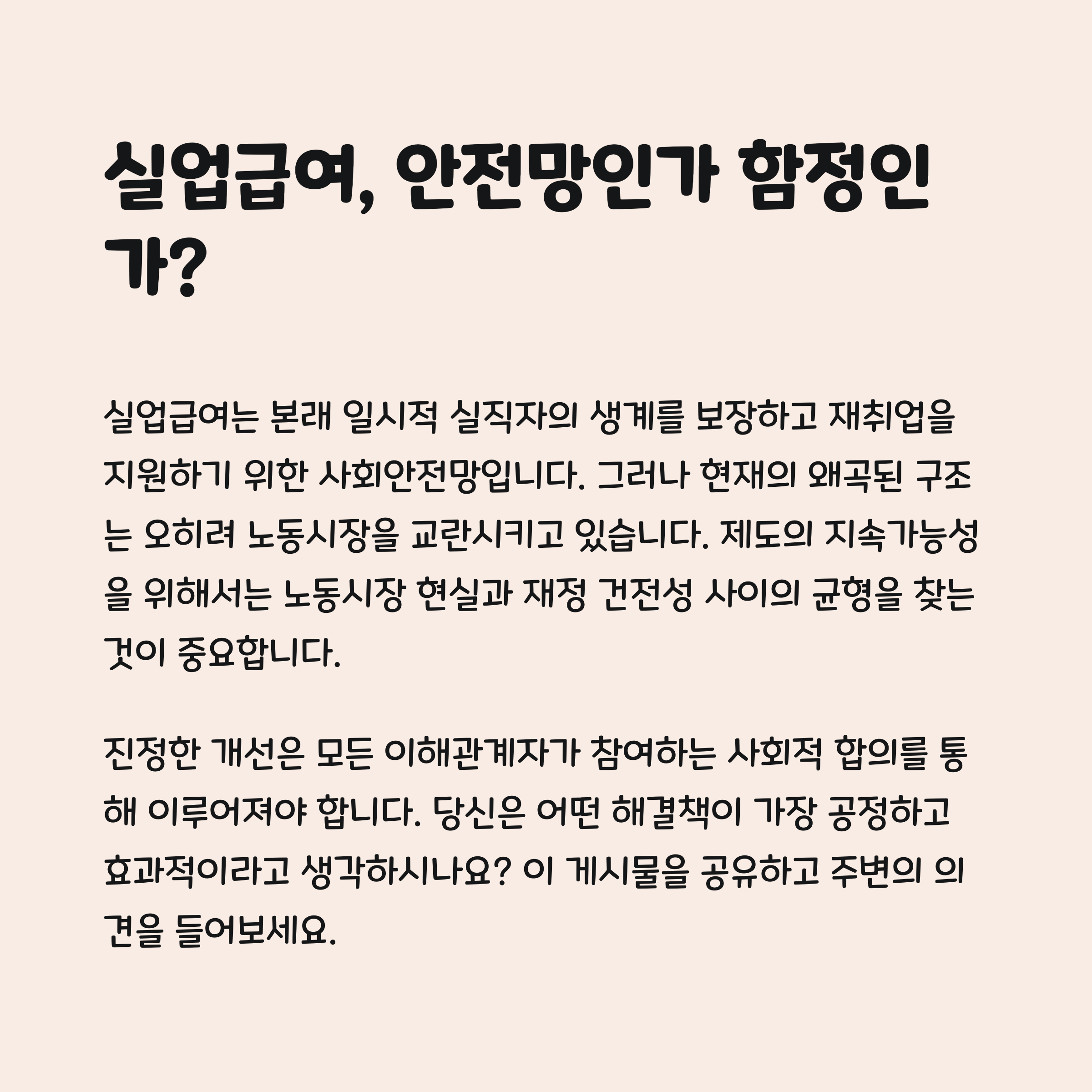노동 가치와 복지 제도의 균형, 그리고 제도의 설계 목적을 다시 고민해야 한다는 메시지를 주고 있어요.