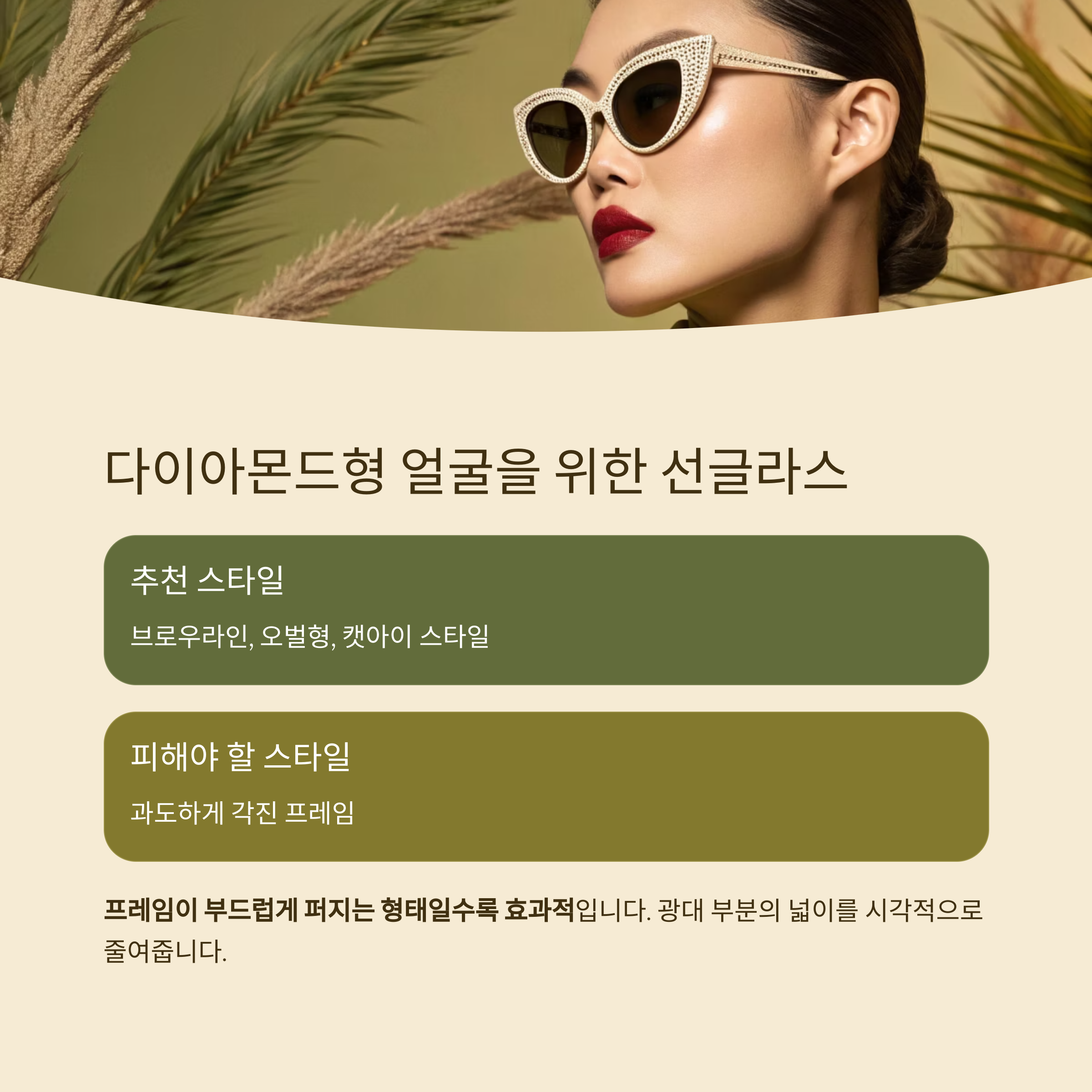| 다이아몬드형 | 브로우라인, 캣아이, 오벌형 | 과도하게 각진 프레임 |