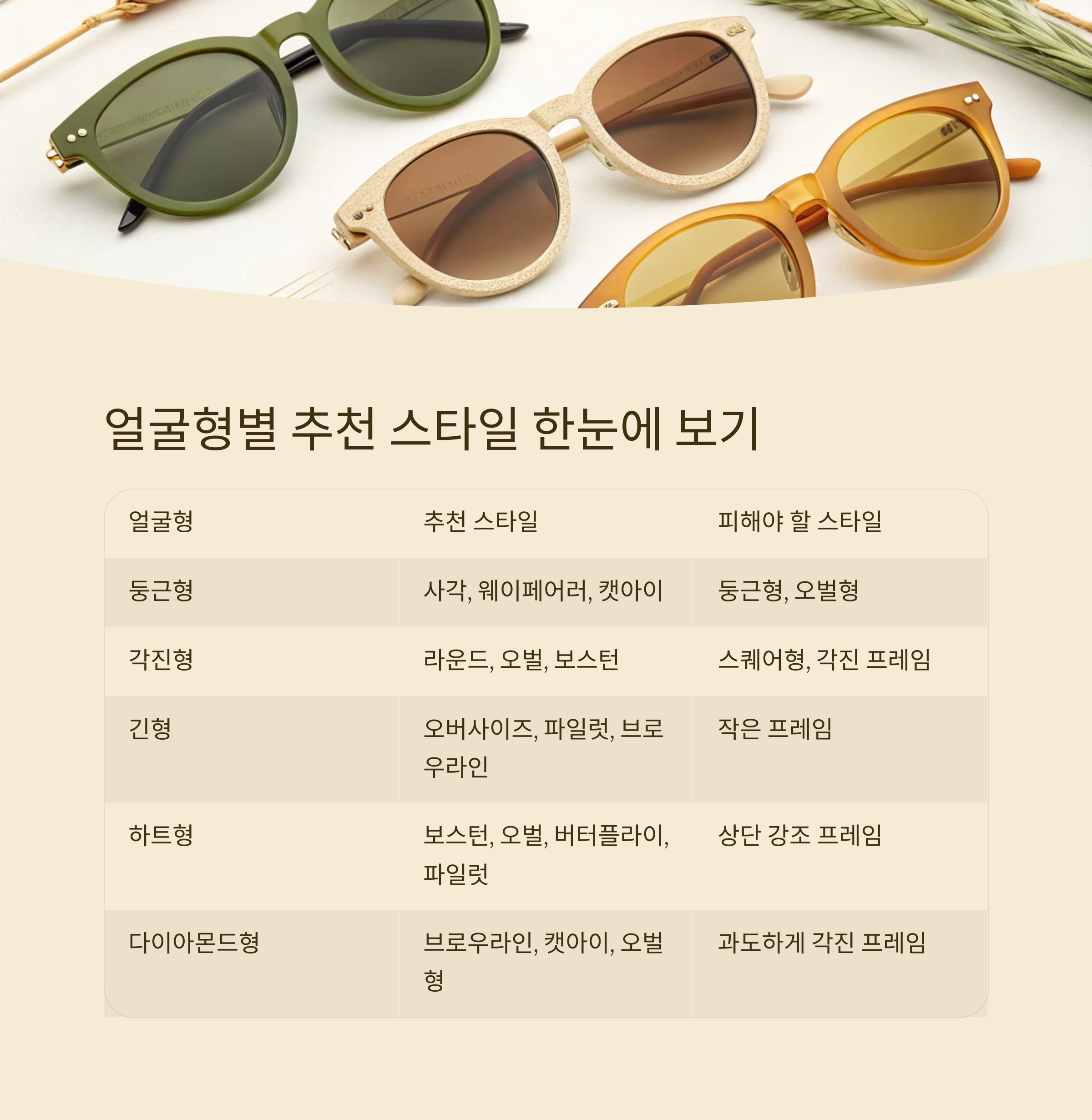 이런 얼굴형에는 선이 분명한 사각형, 웨이페어러, 캣아이 프레임이 잘 어울립니다.