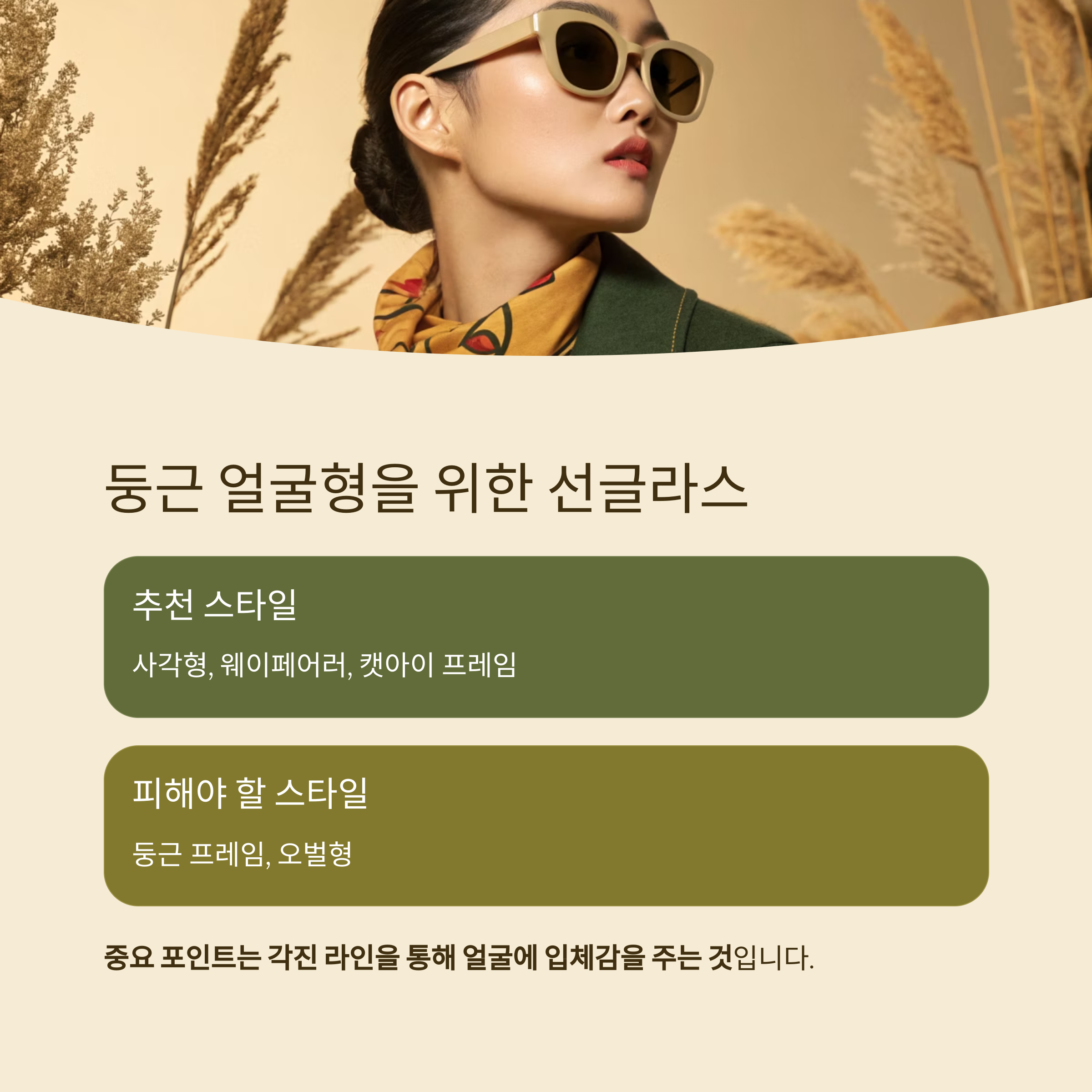 둥근 얼굴형 : 각진 프레임으로 입체감 더하기