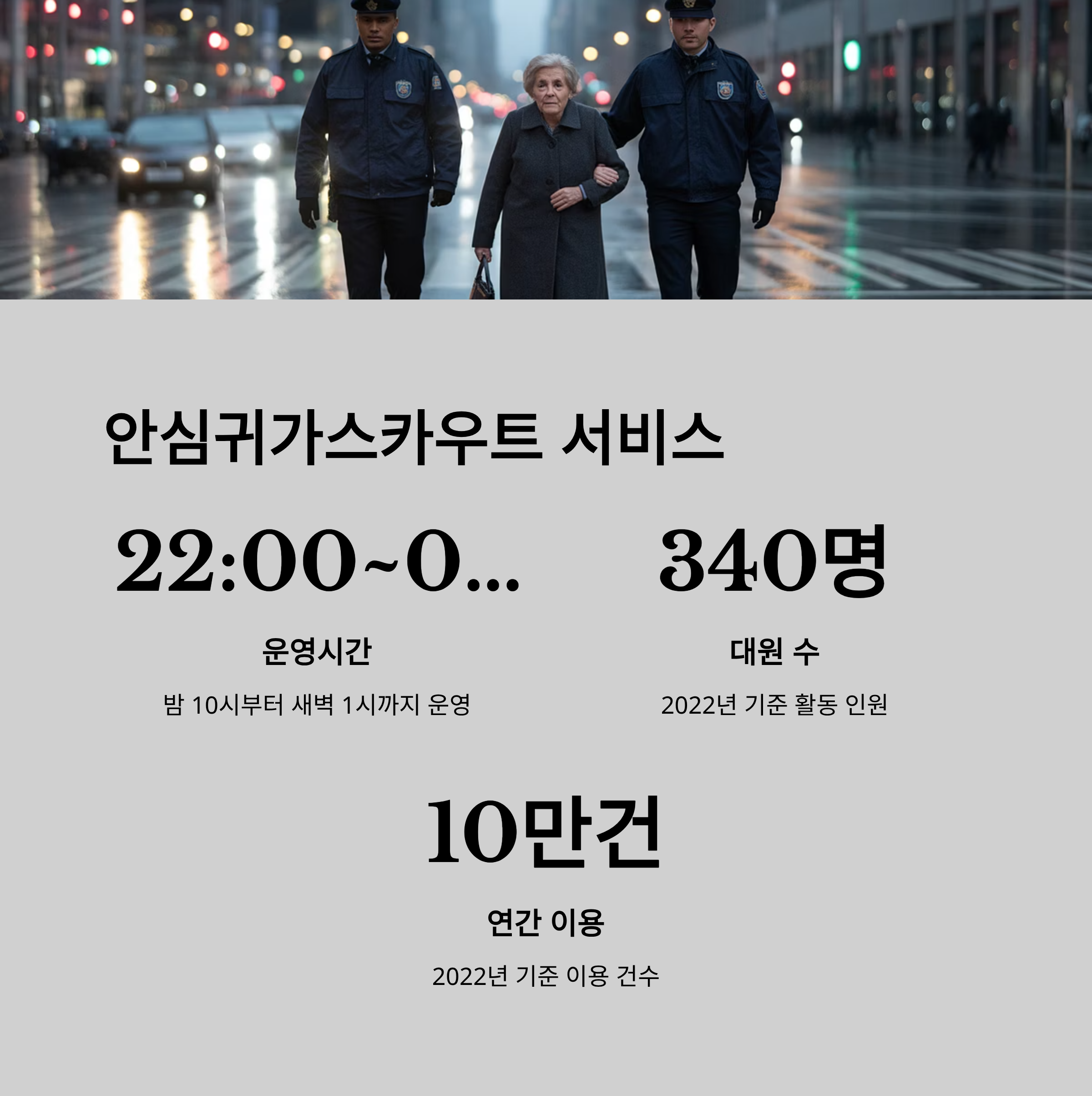 훈련받은 대원이 2인 1조로 사용자의 위치로 출동해 귀가를 돕습니다. 특히 혼자 귀가가