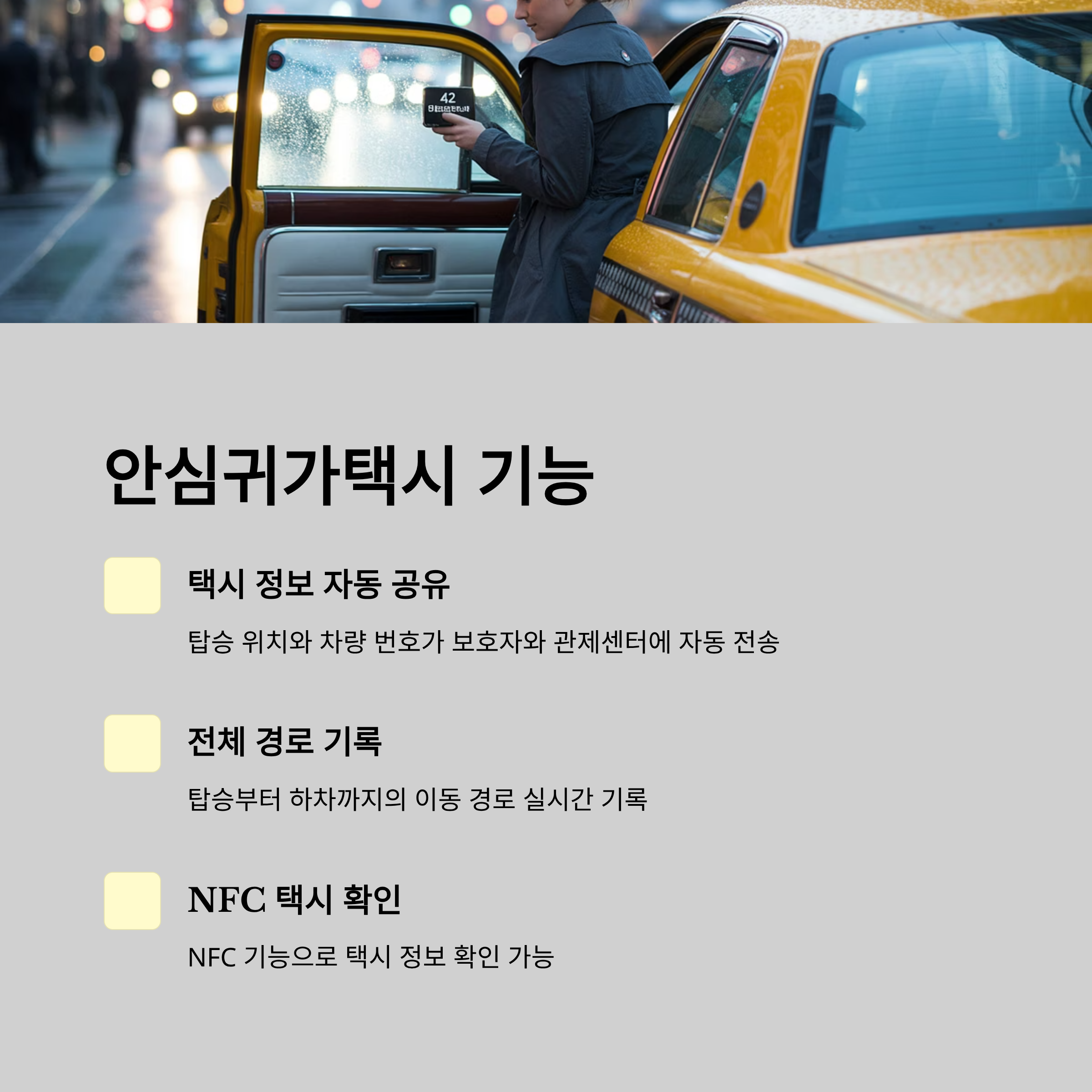 필요 시 NFC 기능을 통해 택시 확인도 가능합니다.