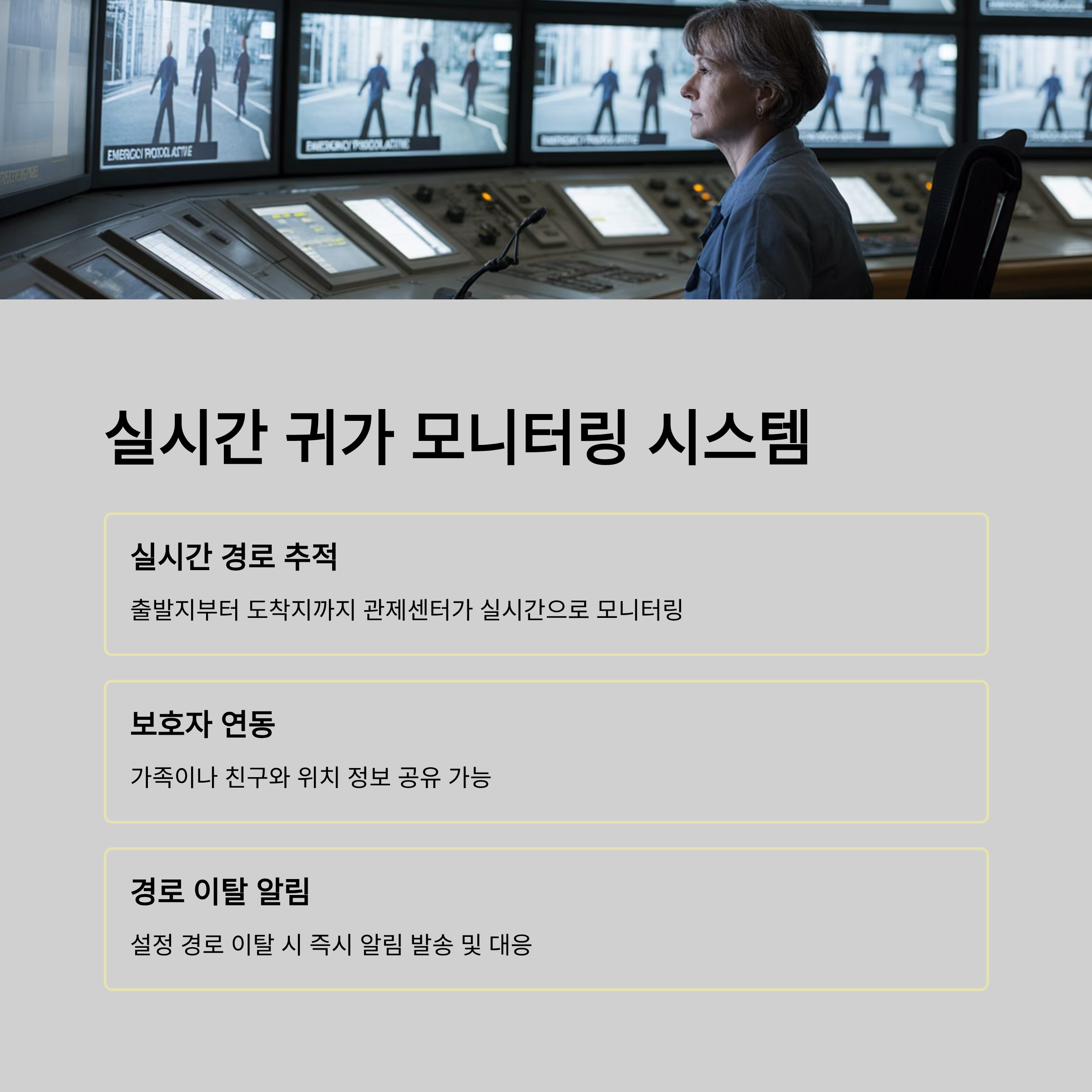 관제센터가 실시간으로 추적하며, 보호자와도 위치 정보가 연동됩니다. 경로 이탈 시 즉시 알림이
