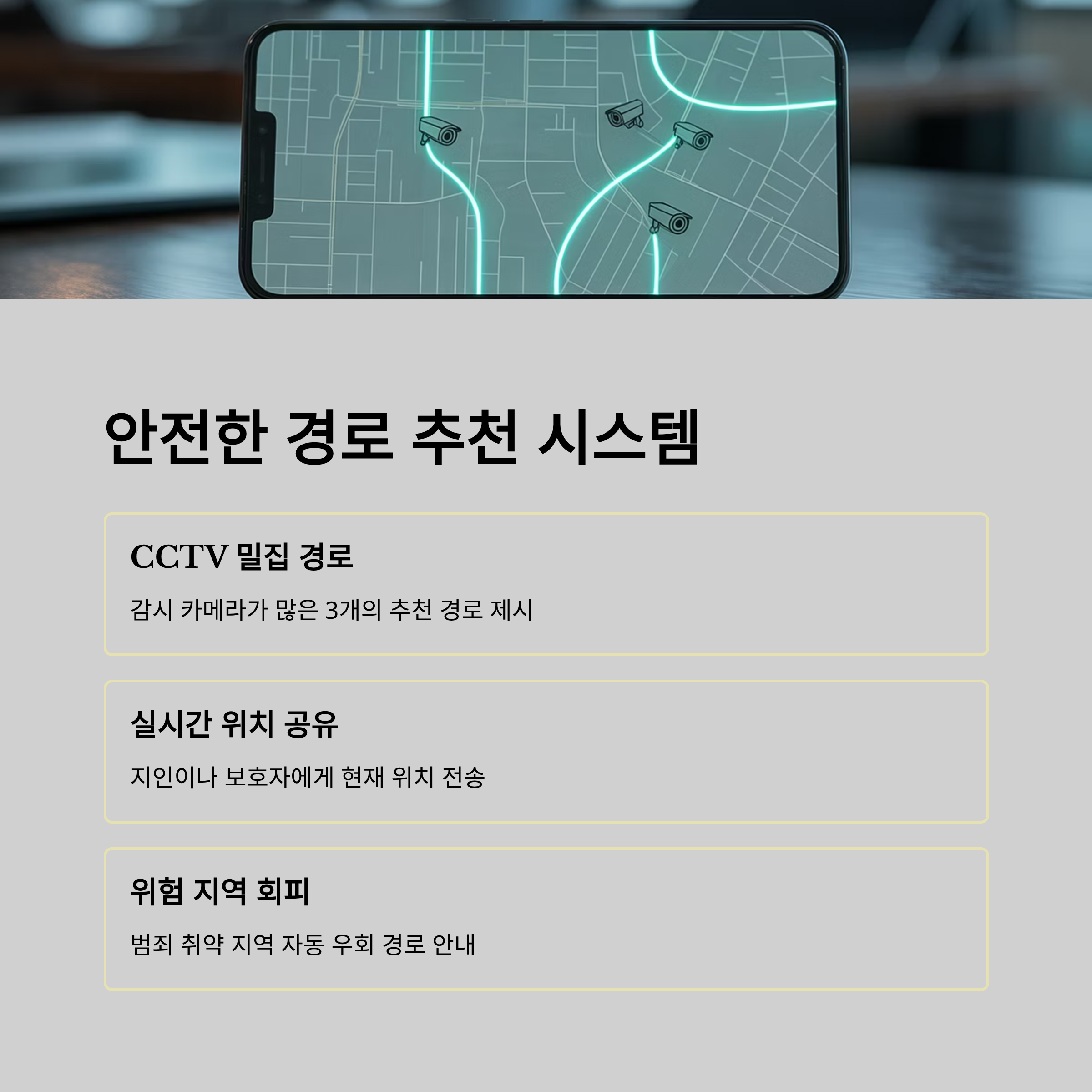 사각지대나 범죄 취약 지역은 자동 회피 경로로 안내합니다.