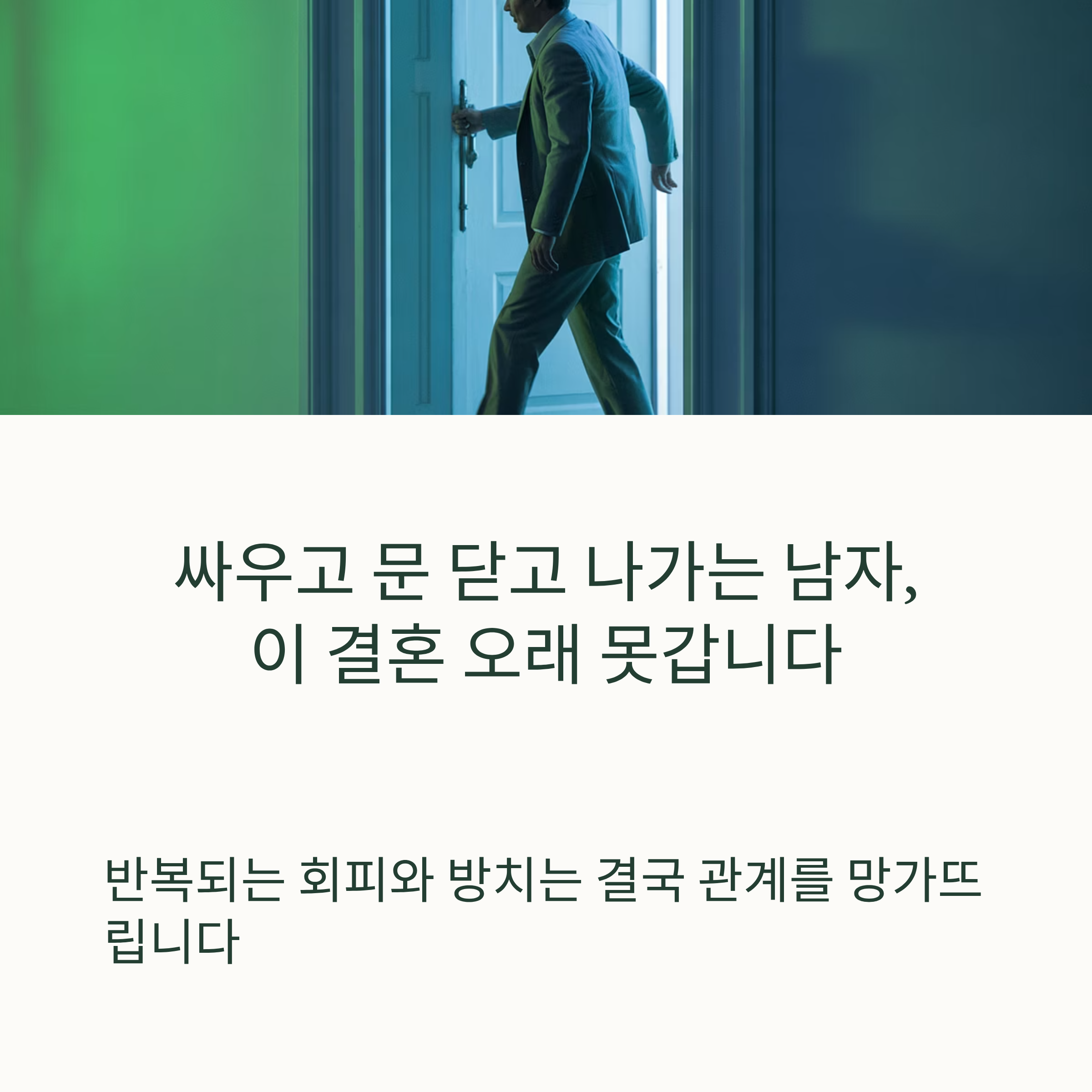 감정이 격해졌을 때 문을 쾅 닫고 나가버리는 남편, 처음엔 그저 화가 나서 그런 줄 알았을지도 모릅니다. 하지만 그 행동이 반복된다면 이야기는 달라집니다. 갈등 상황에서 대화를 거부하고 자리를 피하는 건 결국 문제 해결을 미루는 것이고, 관계의 균열은 점점 커질 수밖에 없습니다. 이 글에서는 그런 행동이 부부 관계에 어떤 영향을 주는지, 왜 이 결혼이 오래가기 힘든지에 대해 이야기해 보겠습니다.