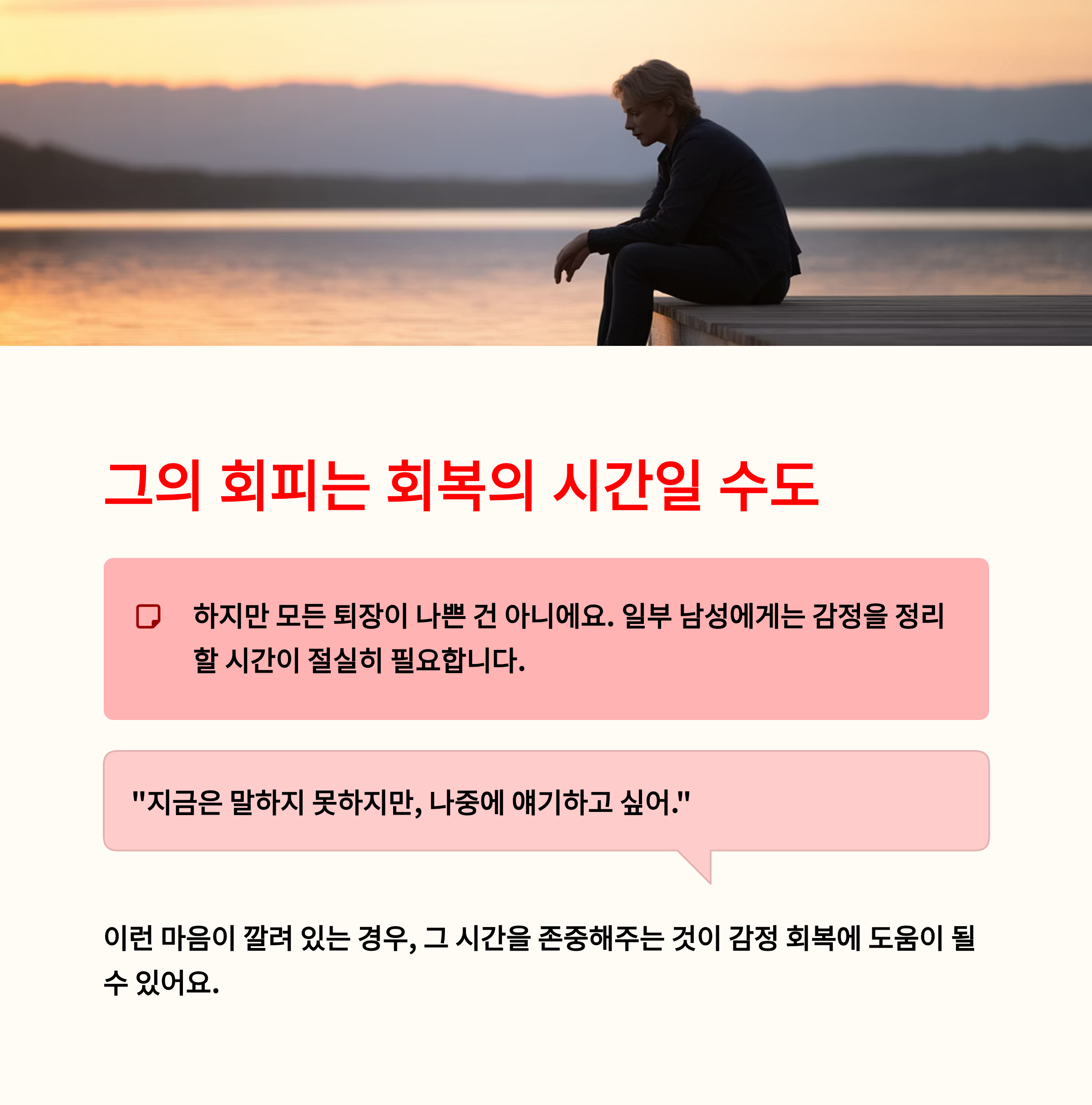 이런 마음이 깔려 있는 경우, 그 시간을 존중해주는 것이 감정 회복에 도움이 될 수 있어요.