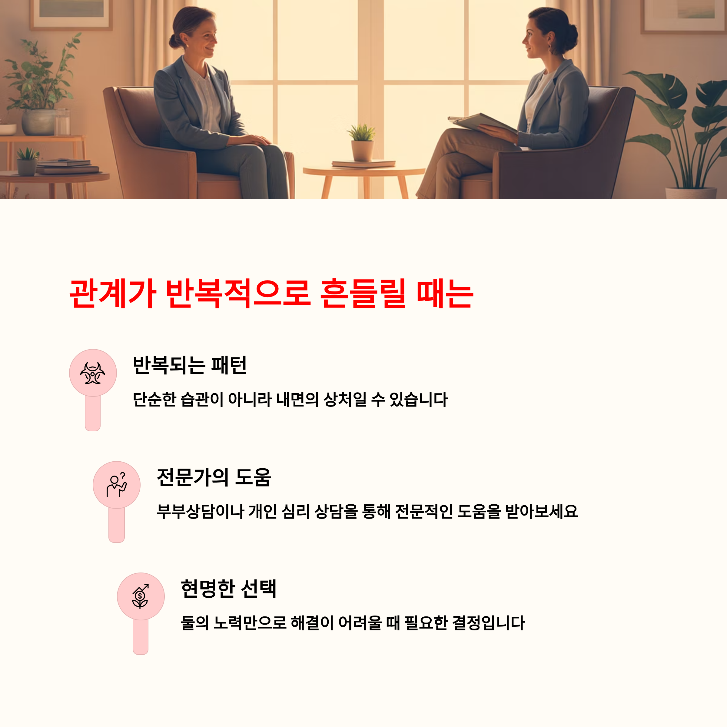 부부상담이나 개인 심리 상담 등을 통해 전문적인 도움을 받아보는 것도 현명한 선택이 됩니다.