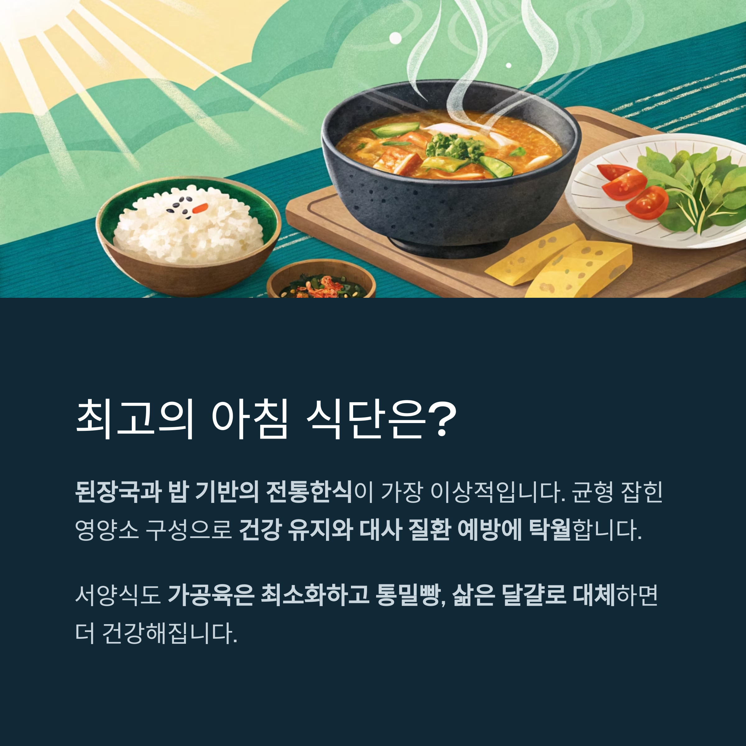 된장국과 밥 기반의 전통한식 아침 식사가 가장 이상적입니다.