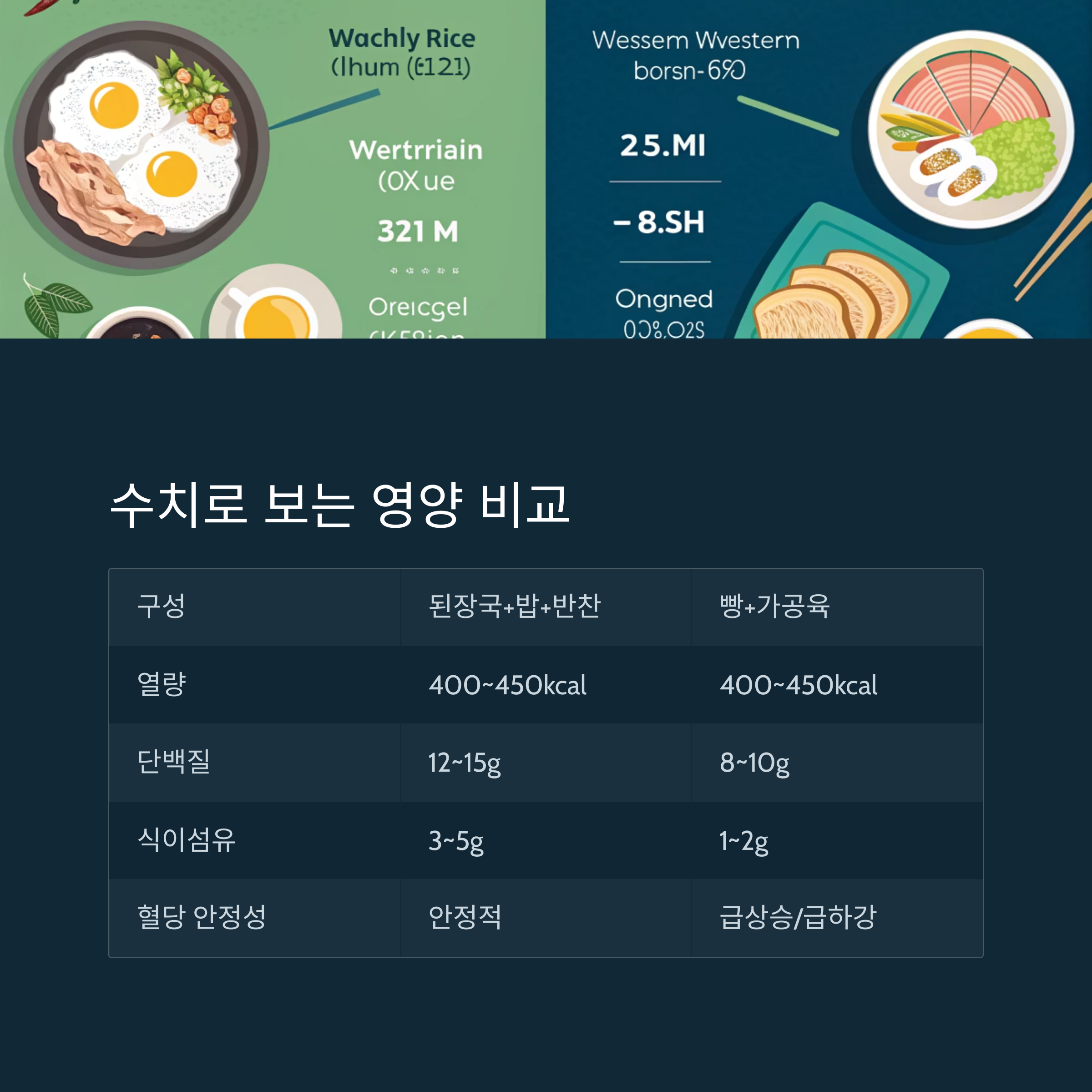 | 메뉴 | 된장국(200ml), 밥(210g), 계란후라이, 나물 | 흰빵 2조각, 베이컨 50g, 버터 10g |