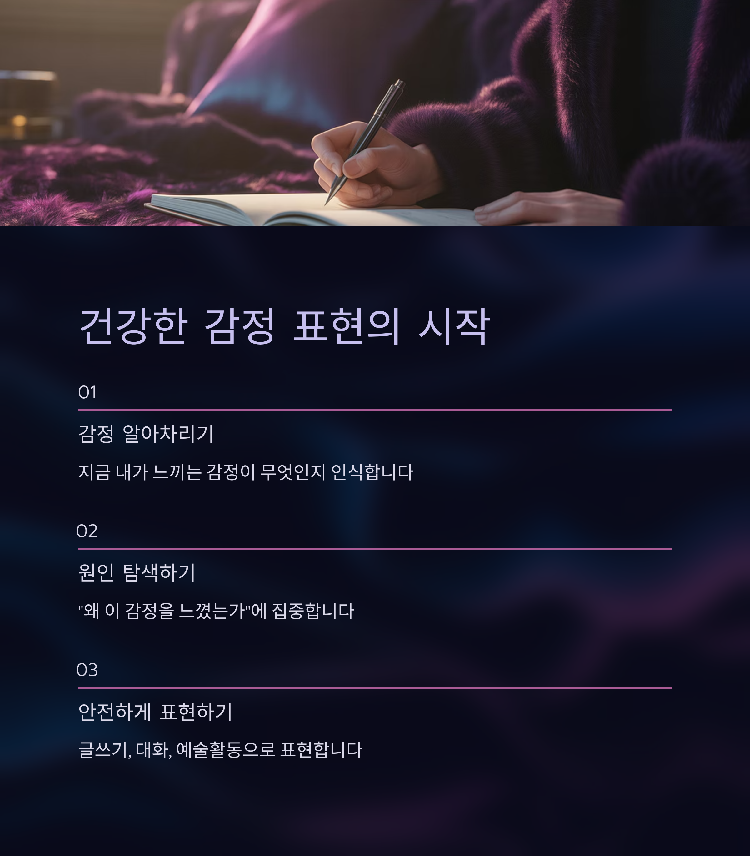 감정을 알아차리고, 그것을 안전하게 표현하는 연습이 필요합니다.