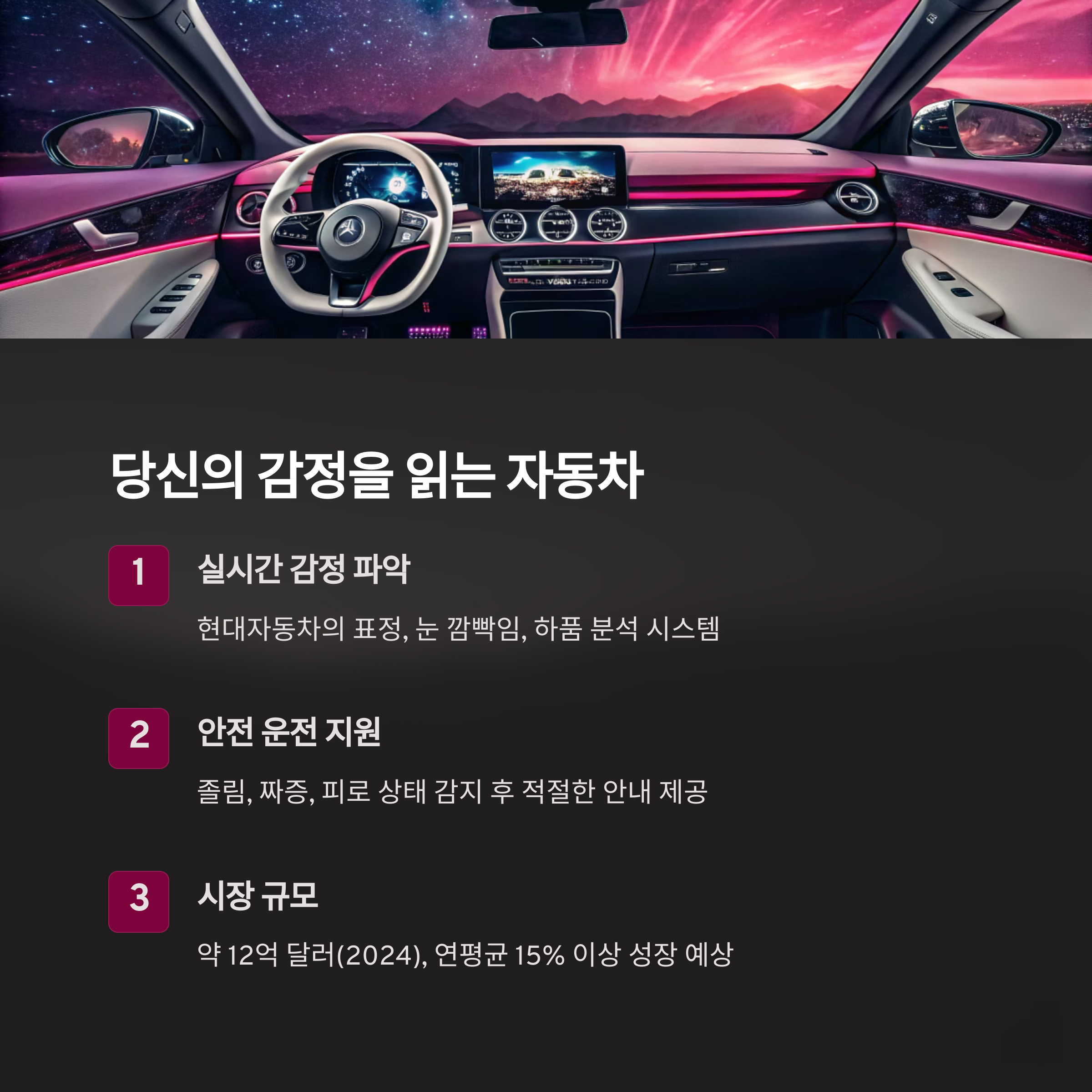 현대자동차는 2024년 일부 모델에 운전자의 감정을 실시간으로 파악하는 시스템을 탑재했습니다.