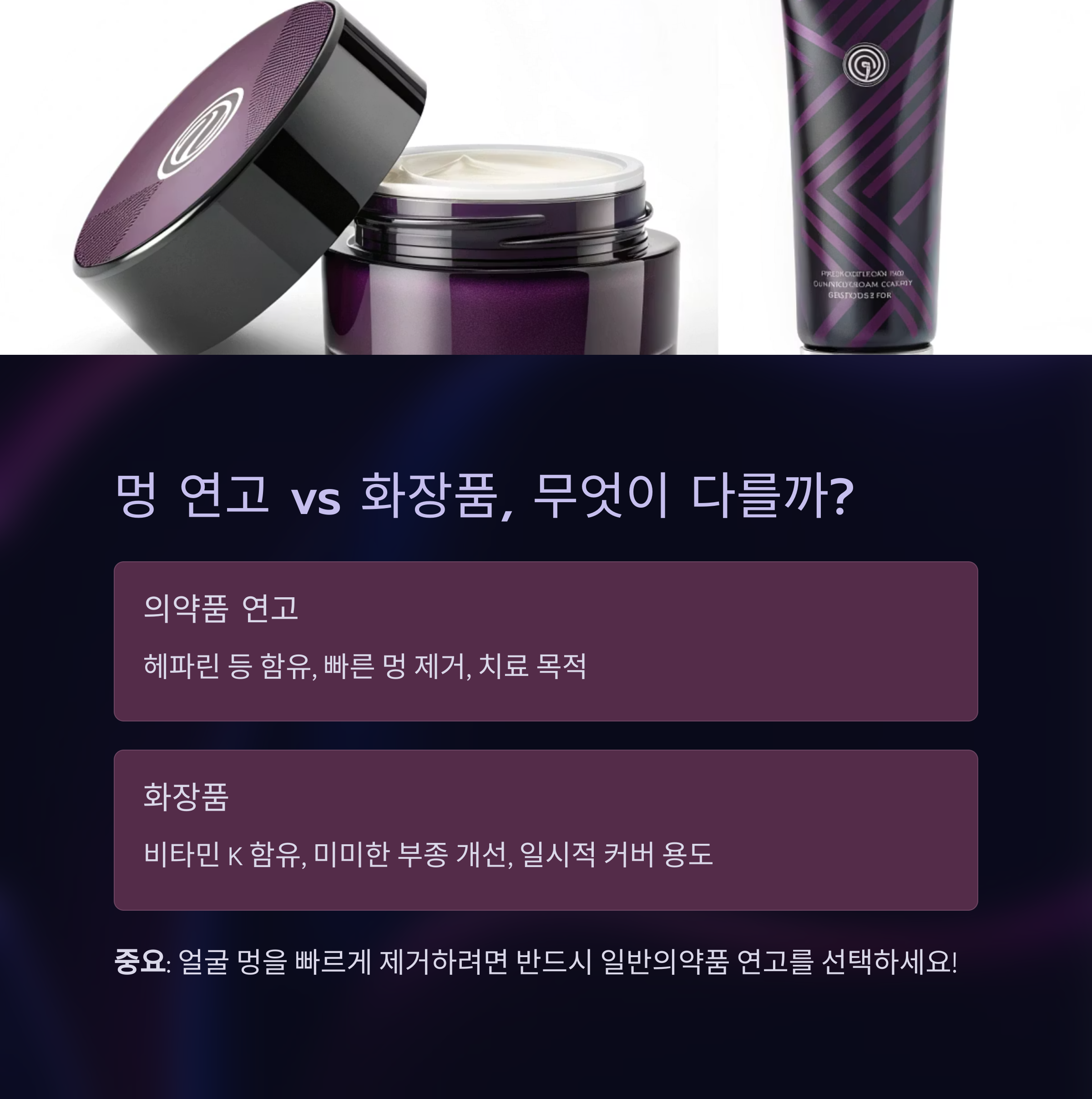 | 의약품 연고 | 헤파린 등 | 빠른 멍 제거 | 치료 목적 |