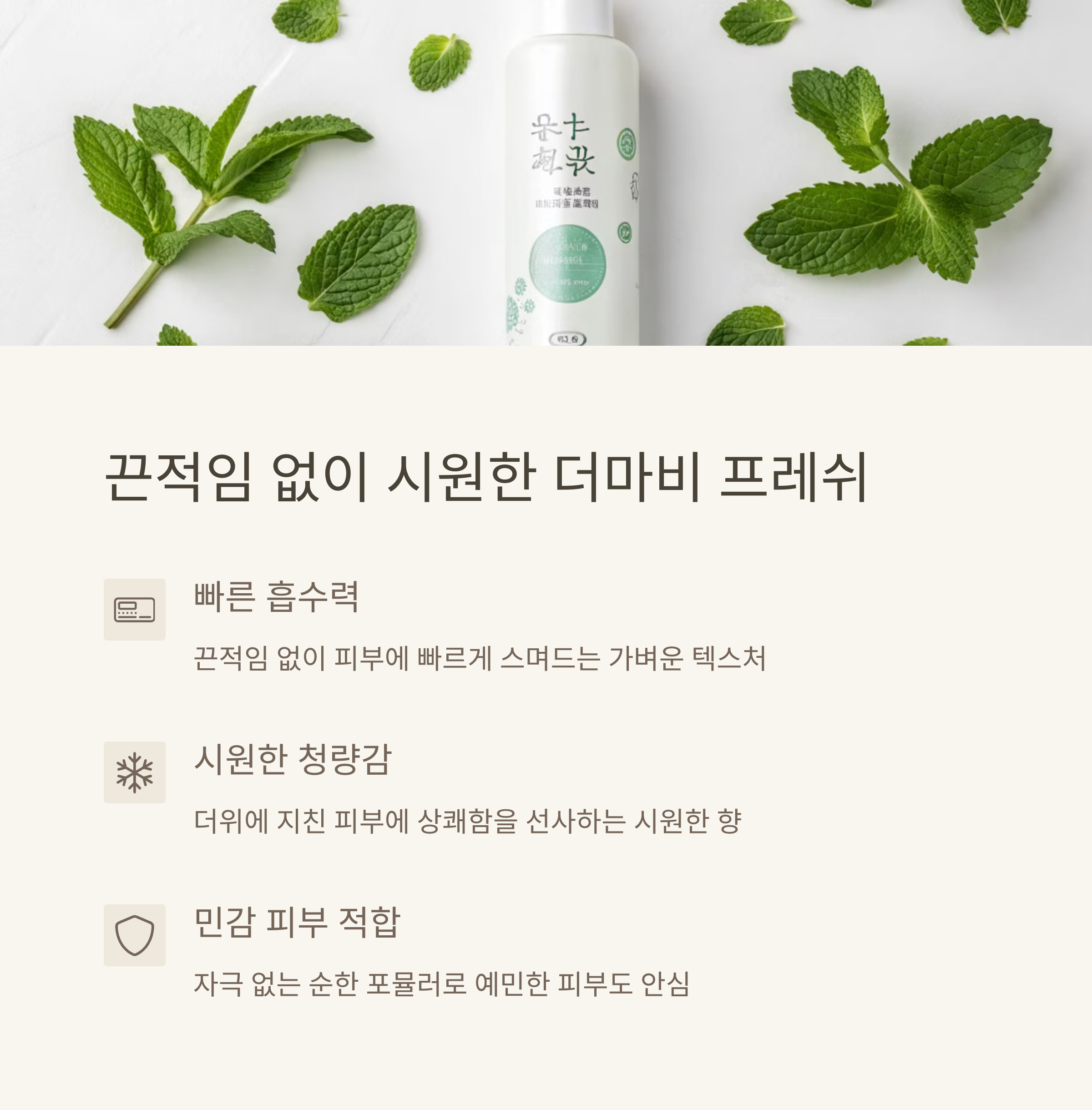 | 더마비 프레쉬 모이스처 바디로션 | 끈적임 없이 빠르게 흡수되며, 은은하고 시원한 향을 제공합니다. |