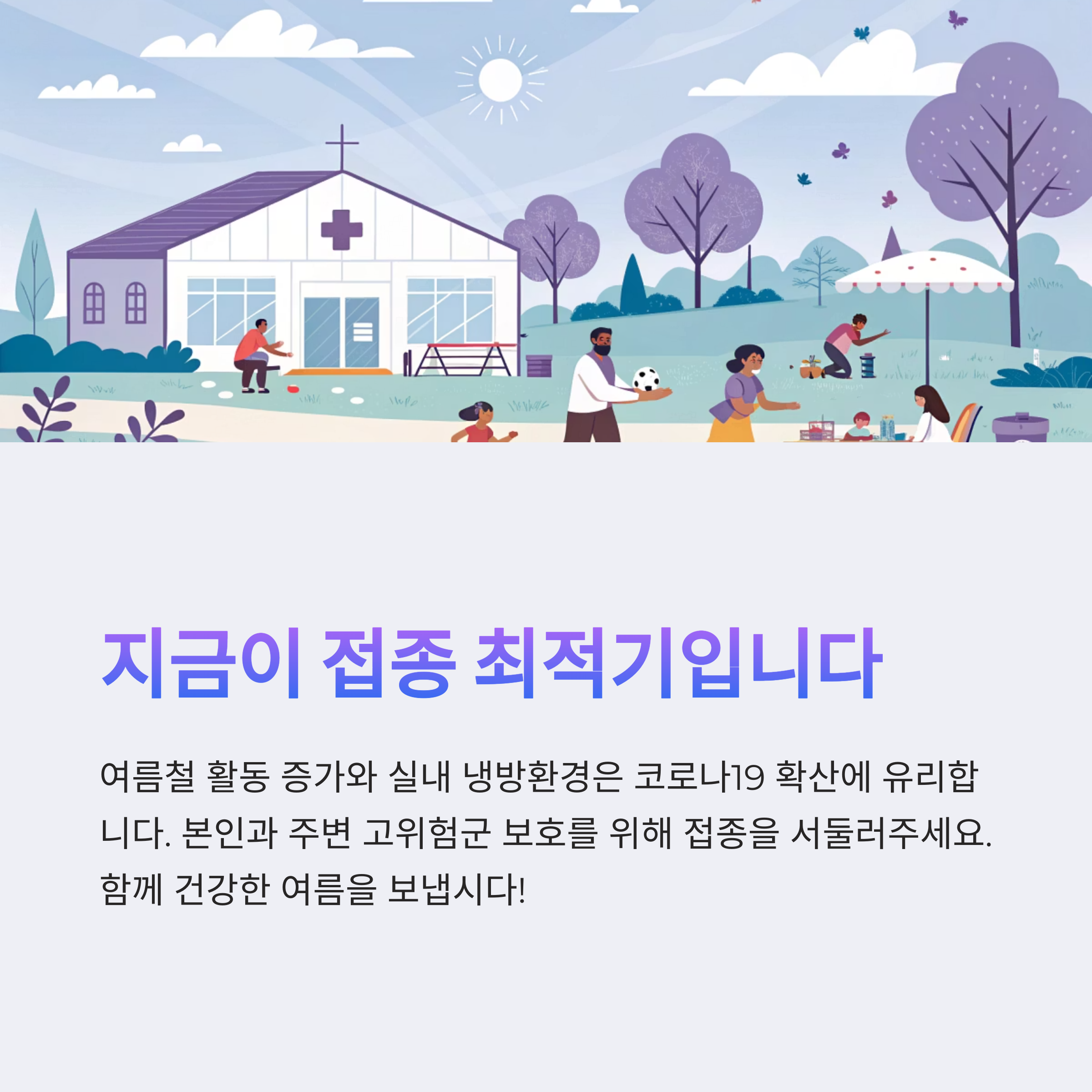 여름철 활동 증가와 실내 냉방환경 확대는 코로나19 바이러스 확산에 유리한 조건이 될 수 있습니다. 접종률을 50% 이상으로 끌어올리기 위해서는 지금이 가장 중요한 시기입니다. 백신 접종을 망설이고 있다면, 본인의 건강은 물론 주변 고위험군 보호를 위해 접종을 서둘러야 합니다.